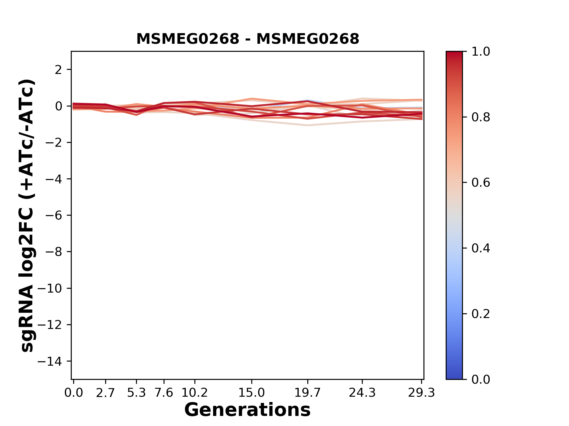 Here, we show sgRNA log2 fold-change values (L2FC) (plus versus minus ATc) over consecutive generations for sgRNAs targeting the gene you selected.