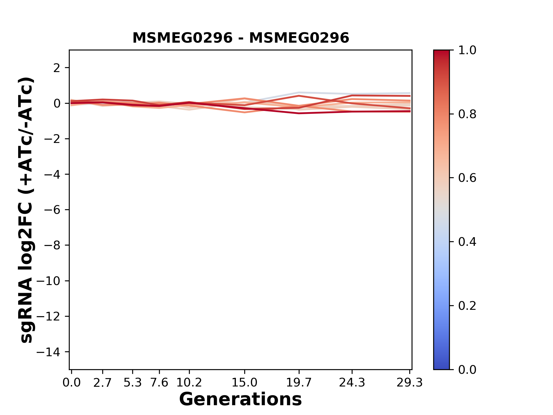 Here, we show sgRNA log2 fold-change values (L2FC) (plus versus minus ATc) over consecutive generations for sgRNAs targeting the gene you selected.