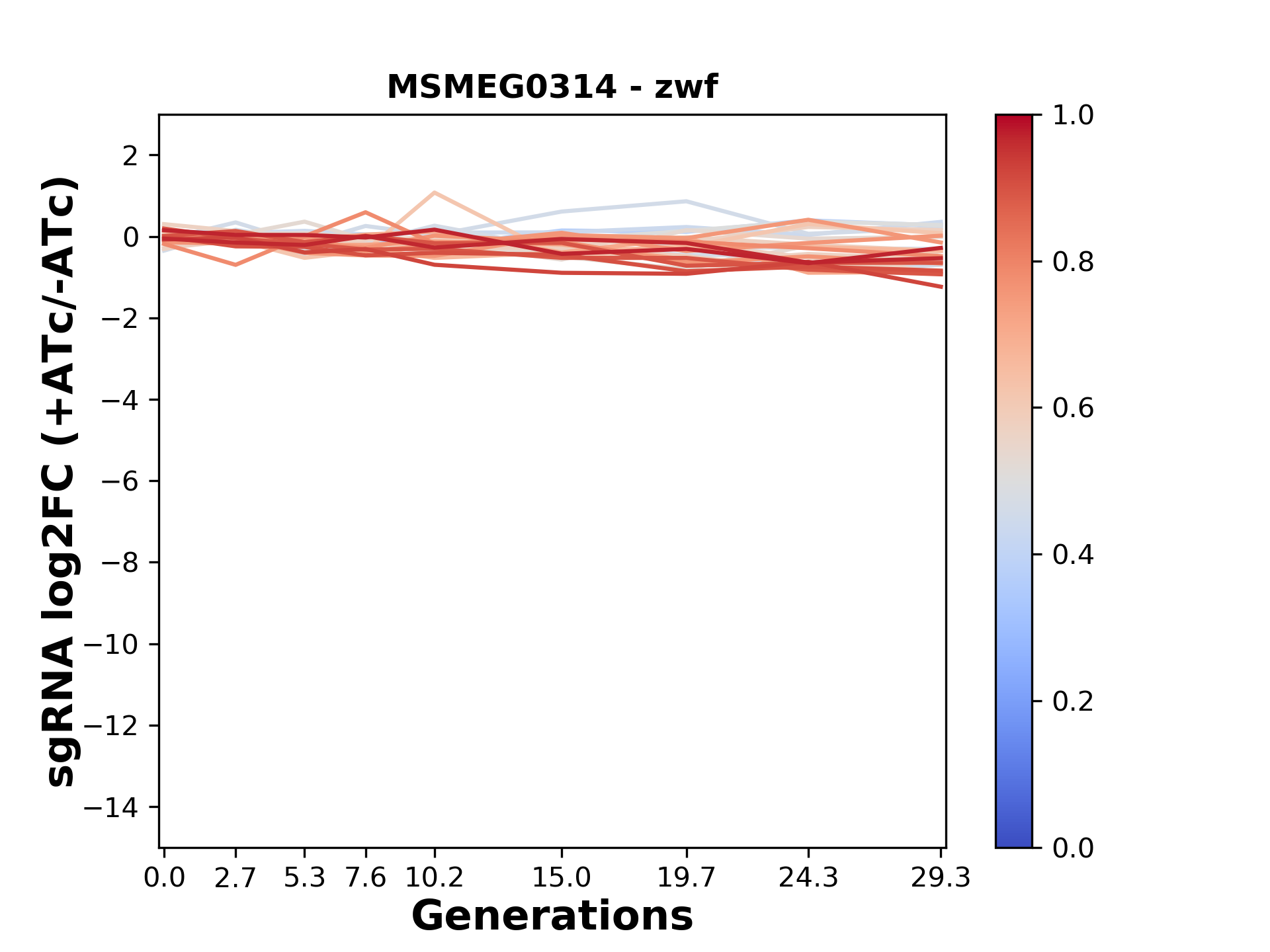 Here, we show sgRNA log2 fold-change values (L2FC) (plus versus minus ATc) over consecutive generations for sgRNAs targeting the gene you selected.