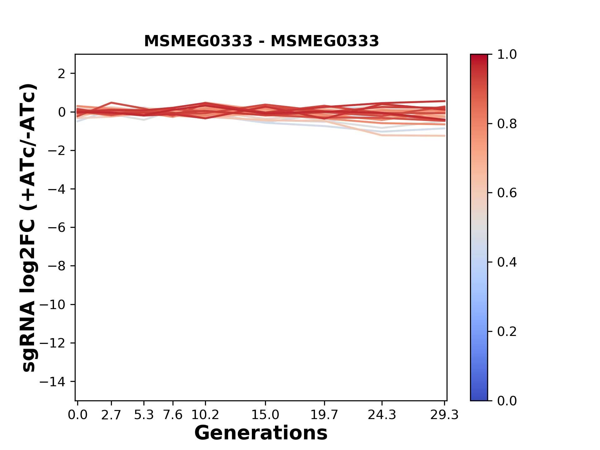 Here, we show sgRNA log2 fold-change values (L2FC) (plus versus minus ATc) over consecutive generations for sgRNAs targeting the gene you selected.