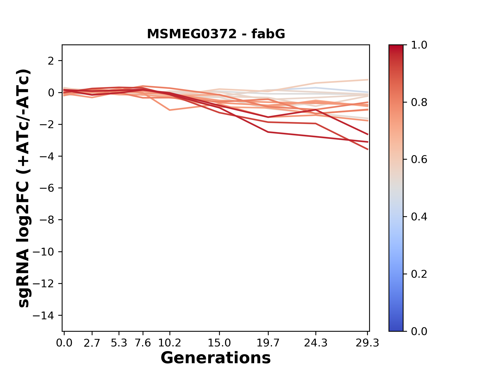 Here, we show sgRNA log2 fold-change values (L2FC) (plus versus minus ATc) over consecutive generations for sgRNAs targeting the gene you selected.