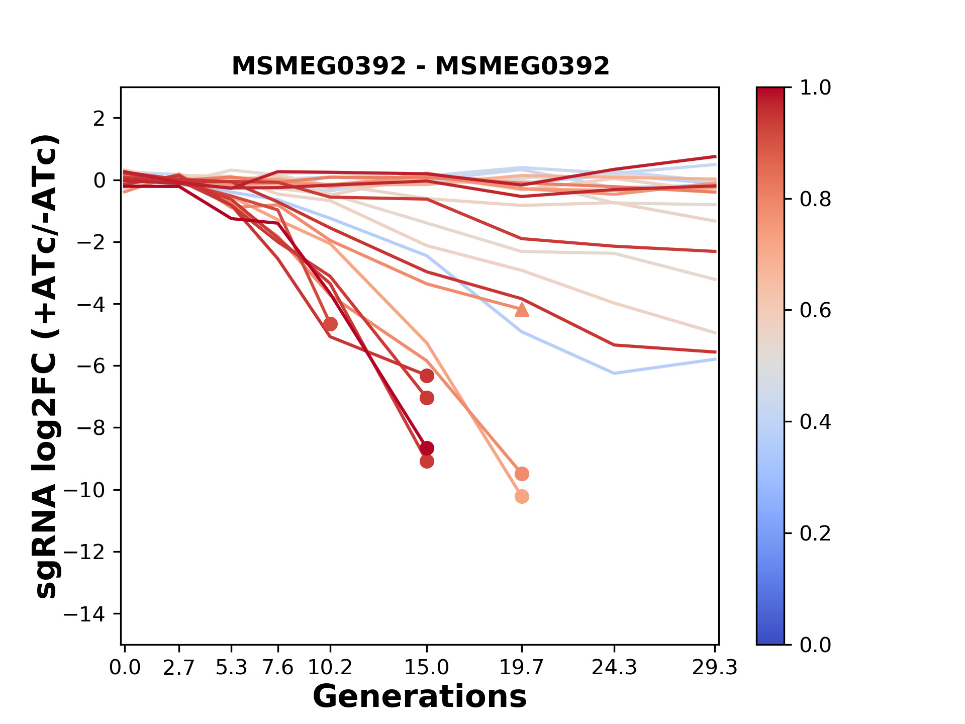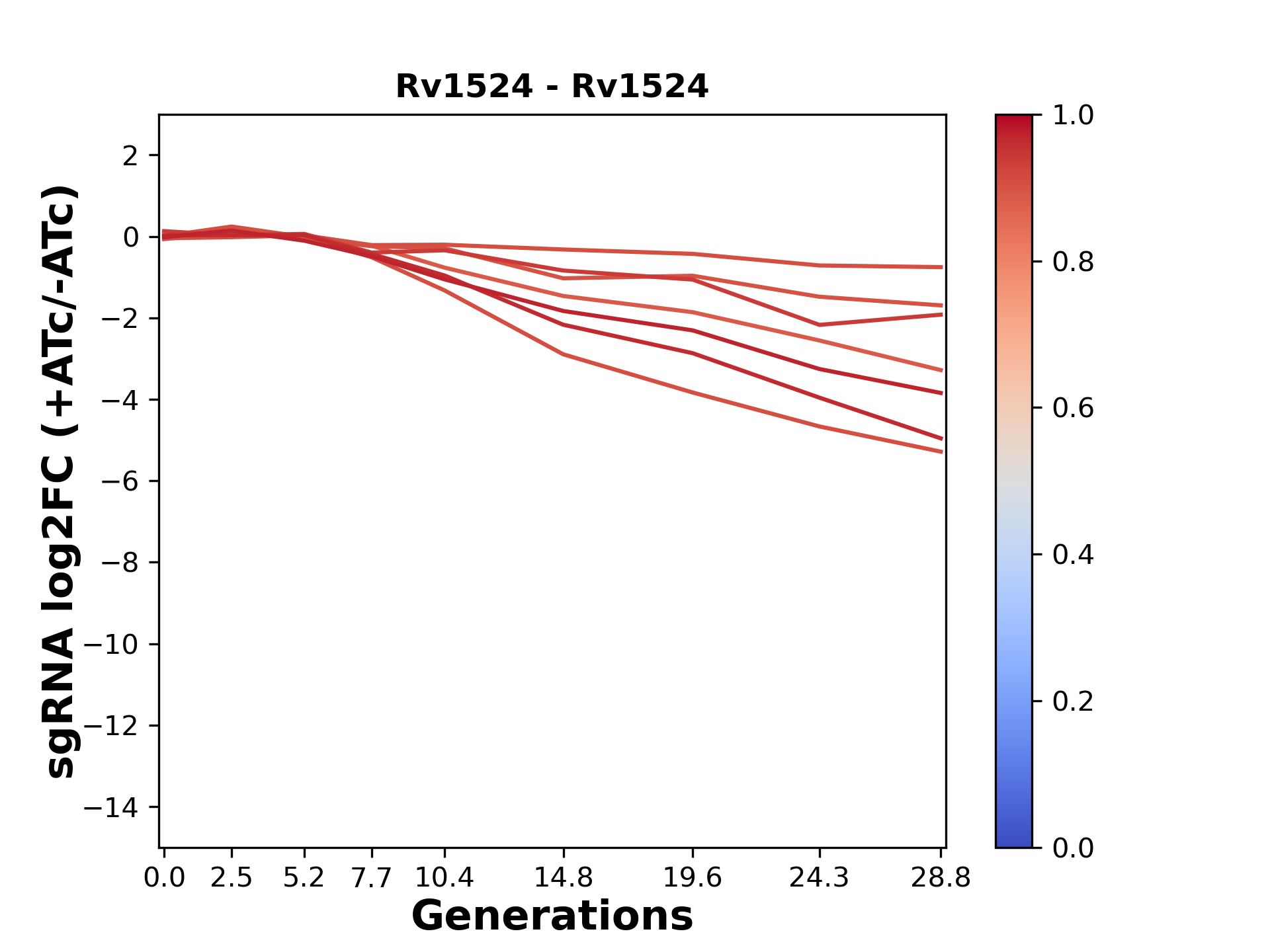 Here, we show sgRNA log2 fold-change values (L2FC) (plus versus minus ATc) over consecutive generations for sgRNAs targeting the gene you selected.