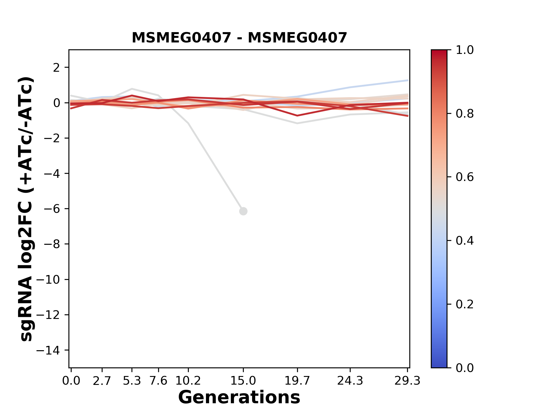 Here, we show sgRNA log2 fold-change values (L2FC) (plus versus minus ATc) over consecutive generations for sgRNAs targeting the gene you selected.