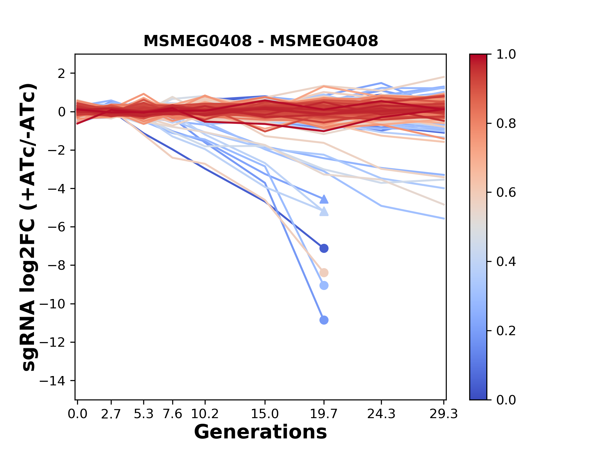 Here, we show sgRNA log2 fold-change values (L2FC) (plus versus minus ATc) over consecutive generations for sgRNAs targeting the gene you selected.