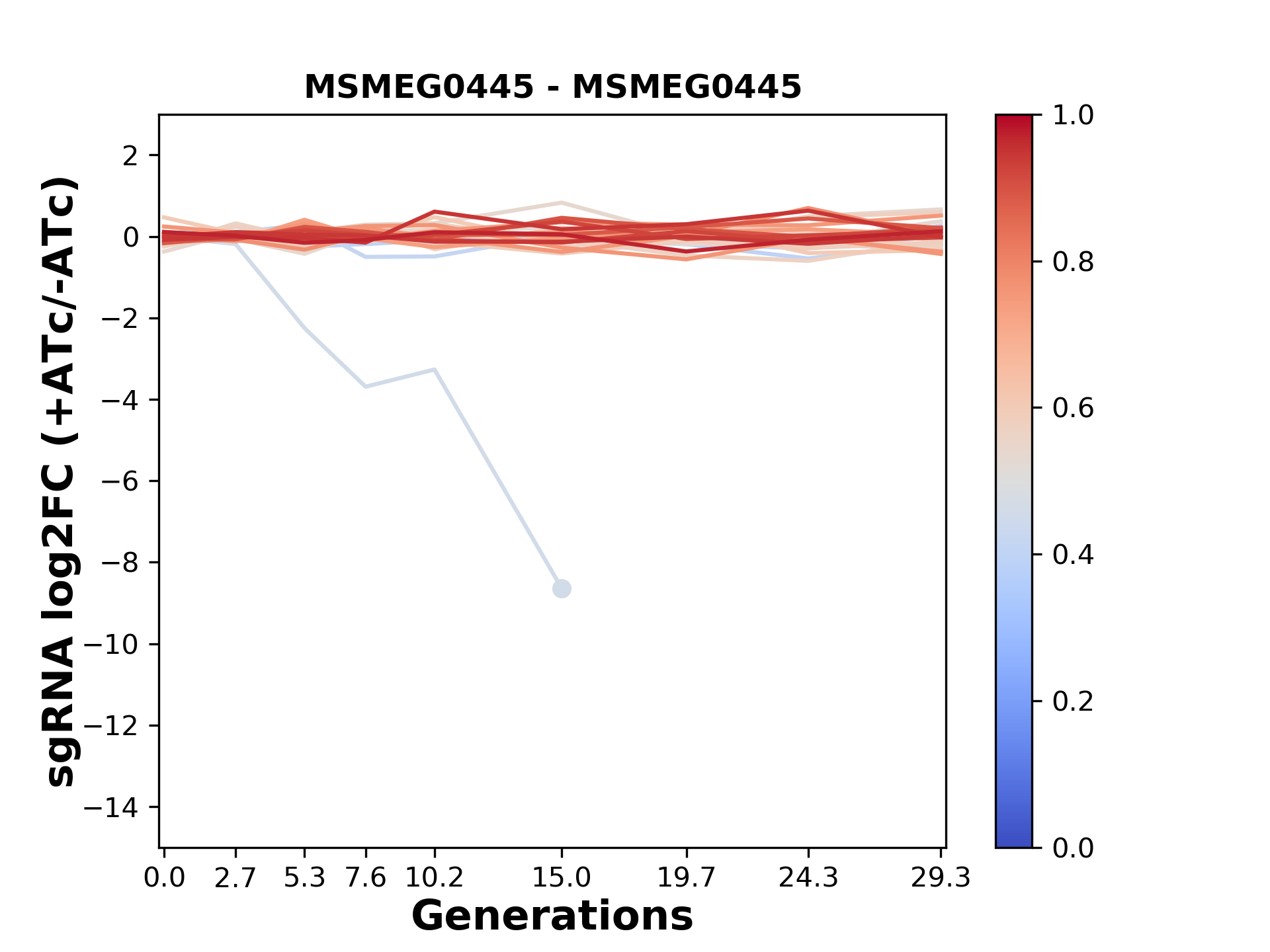 Here, we show sgRNA log2 fold-change values (L2FC) (plus versus minus ATc) over consecutive generations for sgRNAs targeting the gene you selected.