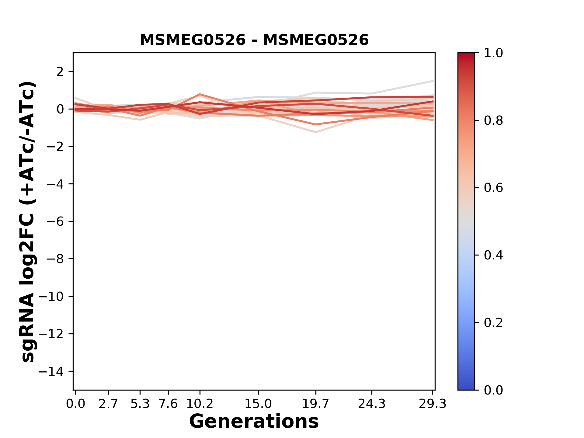 Here, we show sgRNA log2 fold-change values (L2FC) (plus versus minus ATc) over consecutive generations for sgRNAs targeting the gene you selected.