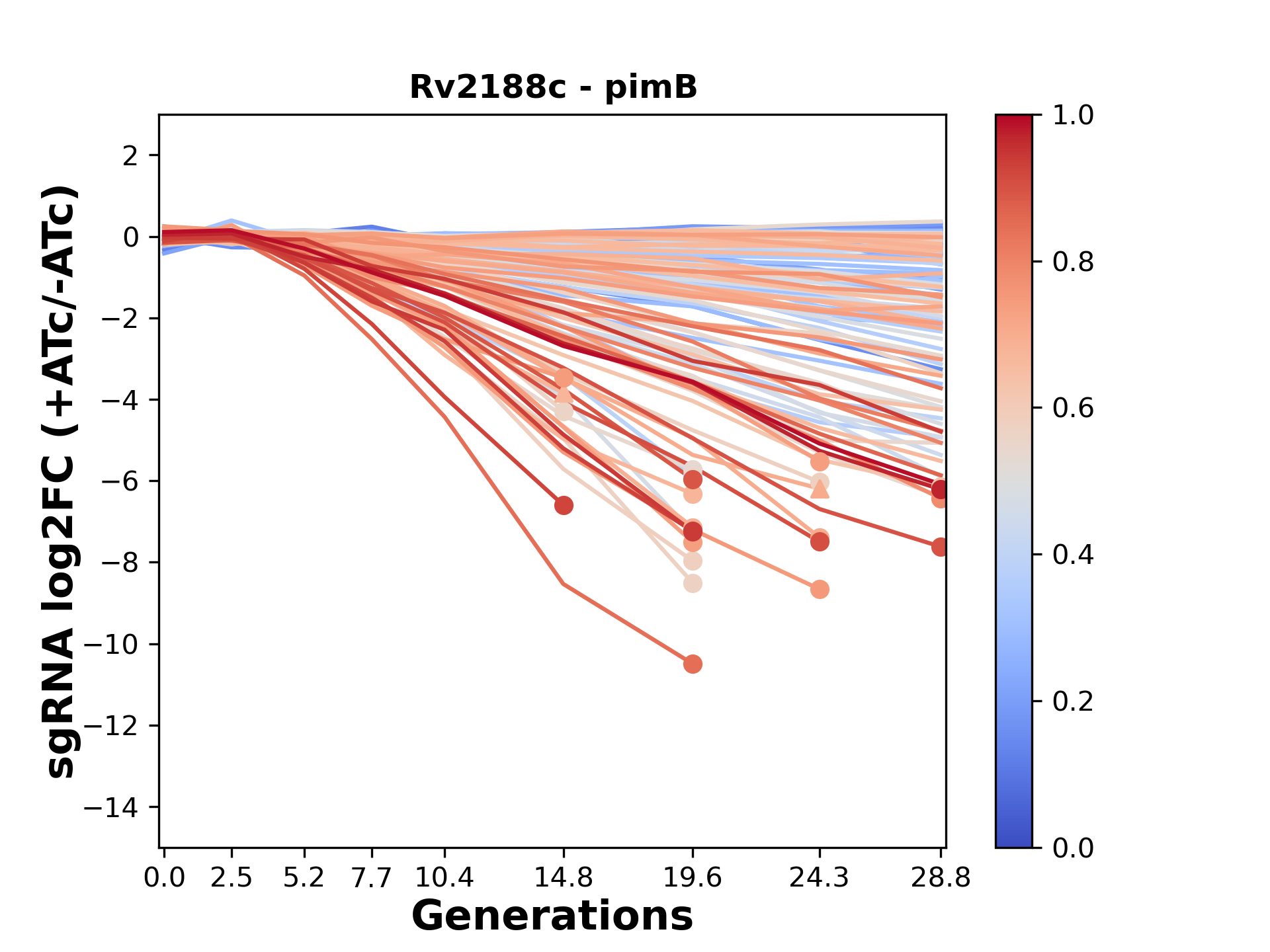 Here, we show sgRNA log2 fold-change values (L2FC) (plus versus minus ATc) over consecutive generations for sgRNAs targeting the gene you selected.