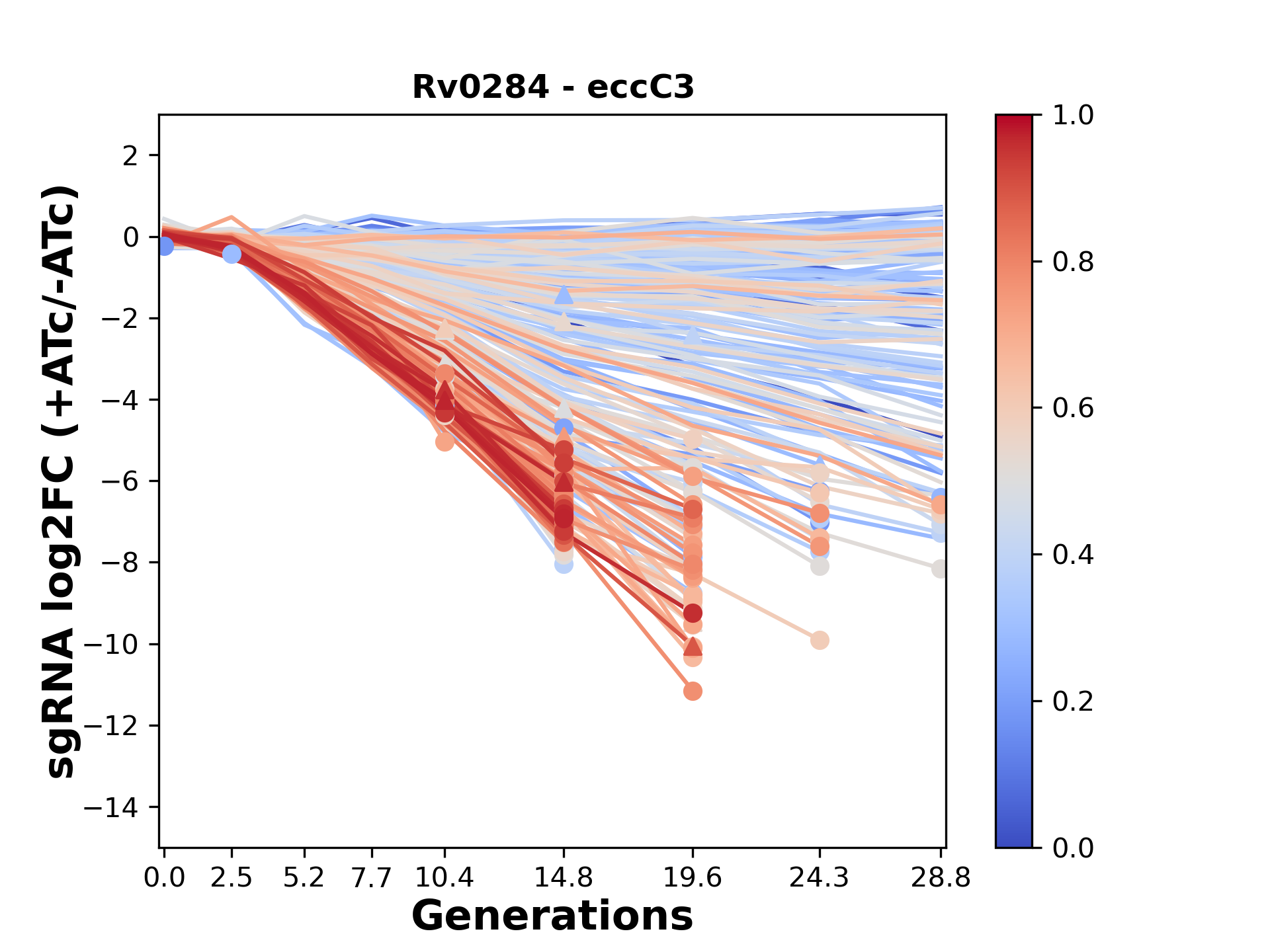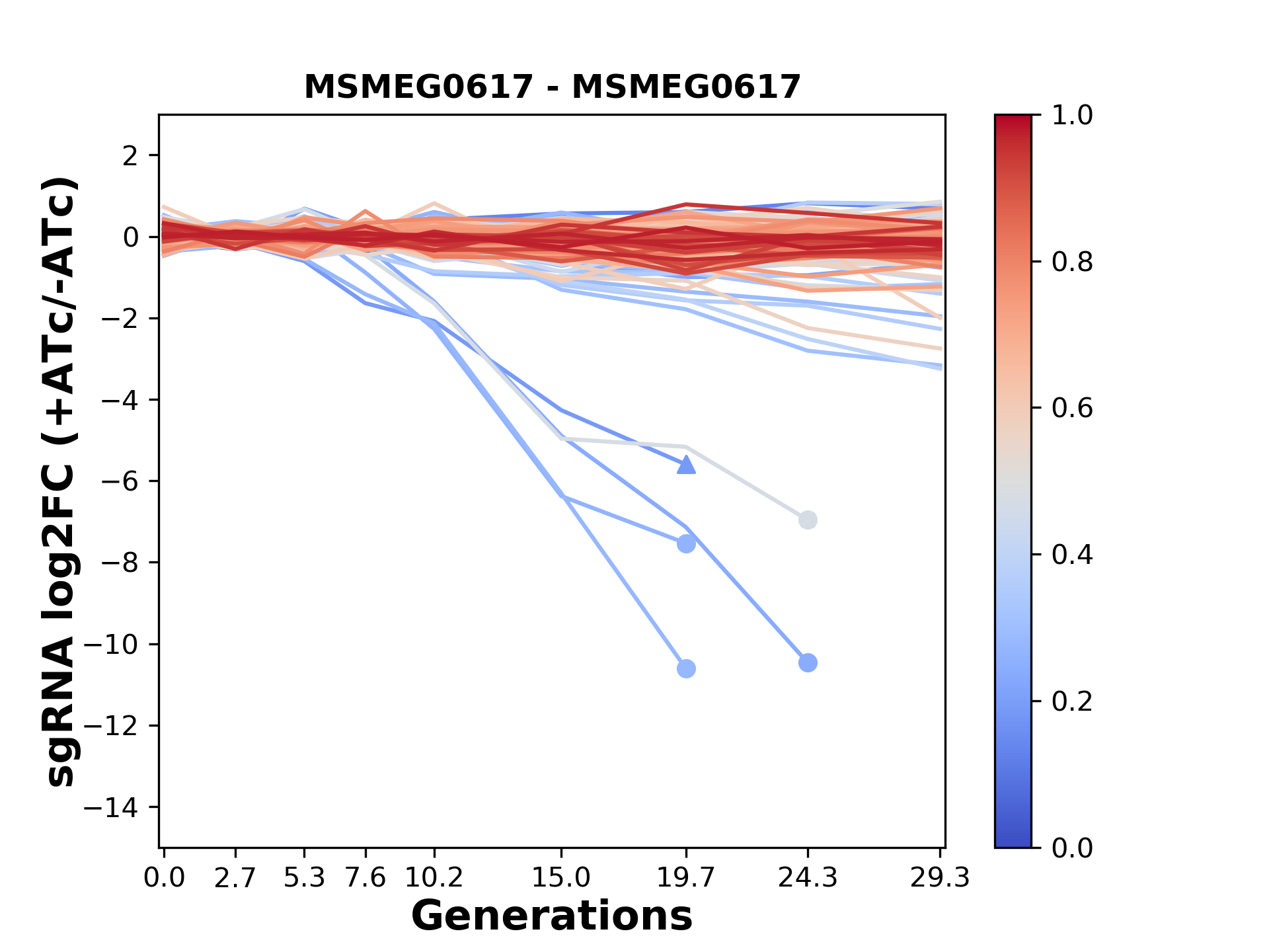 Here, we show sgRNA log2 fold-change values (L2FC) (plus versus minus ATc) over consecutive generations for sgRNAs targeting the gene you selected.
