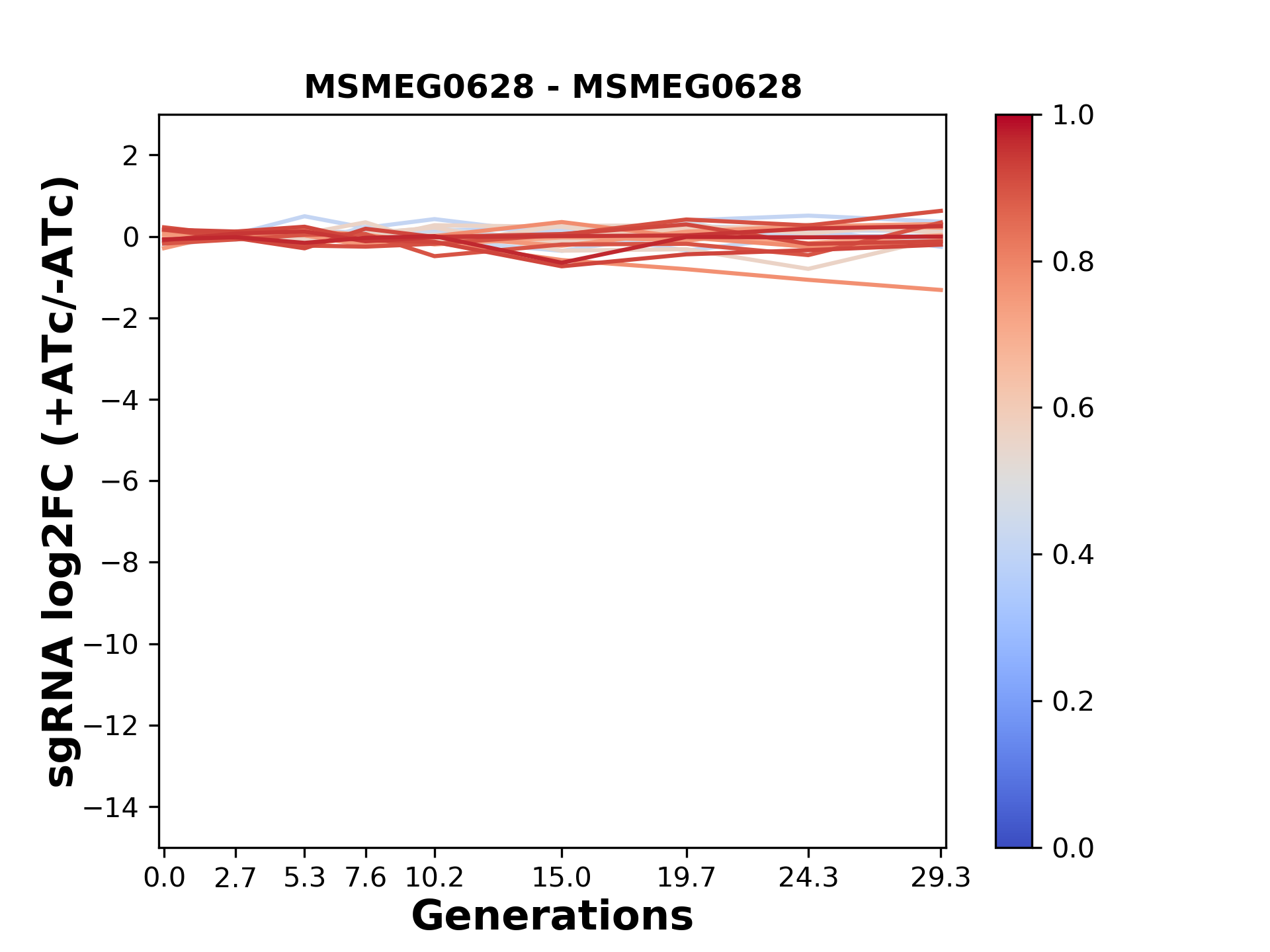 Here, we show sgRNA log2 fold-change values (L2FC) (plus versus minus ATc) over consecutive generations for sgRNAs targeting the gene you selected.