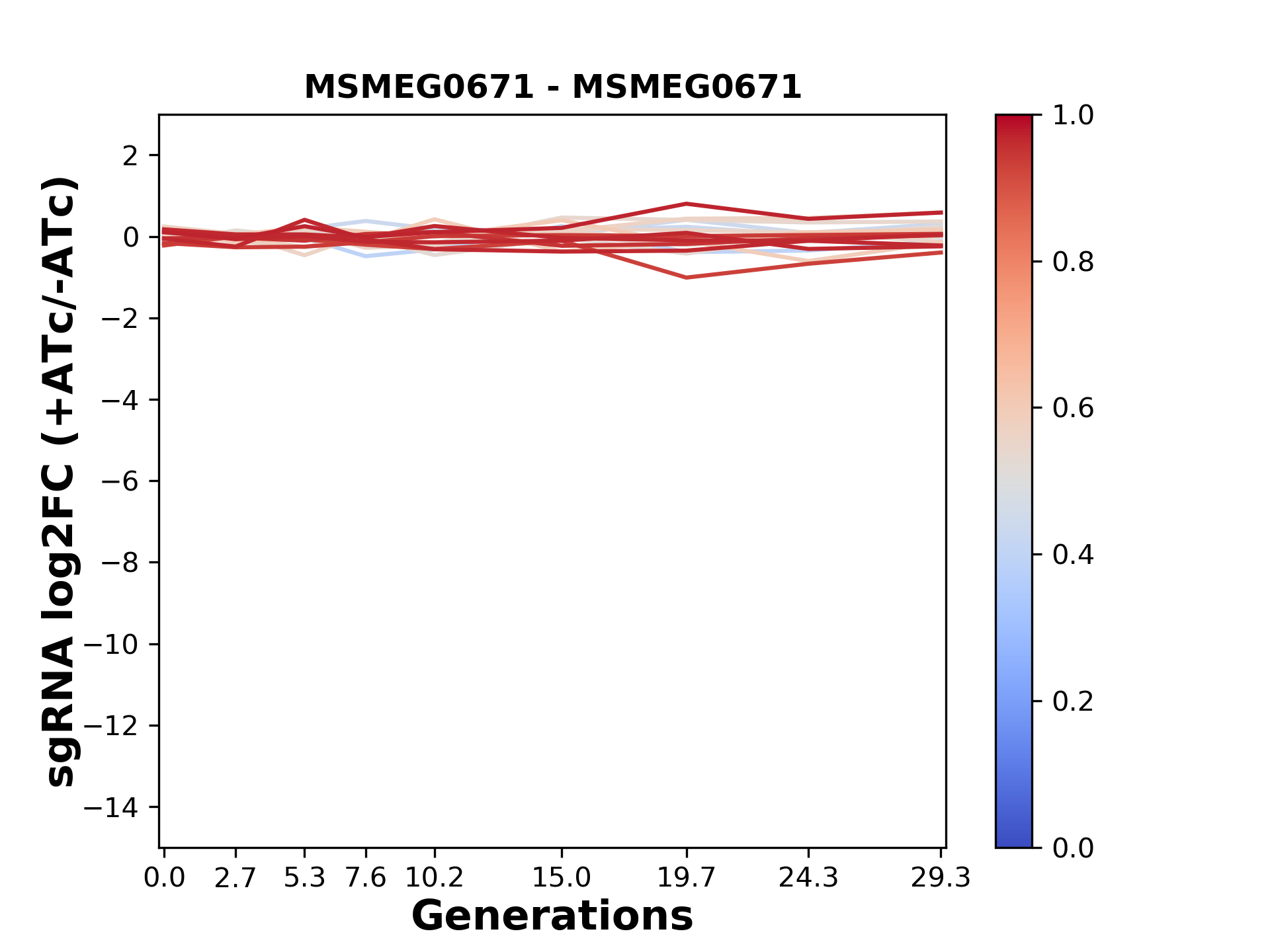 Here, we show sgRNA log2 fold-change values (L2FC) (plus versus minus ATc) over consecutive generations for sgRNAs targeting the gene you selected.