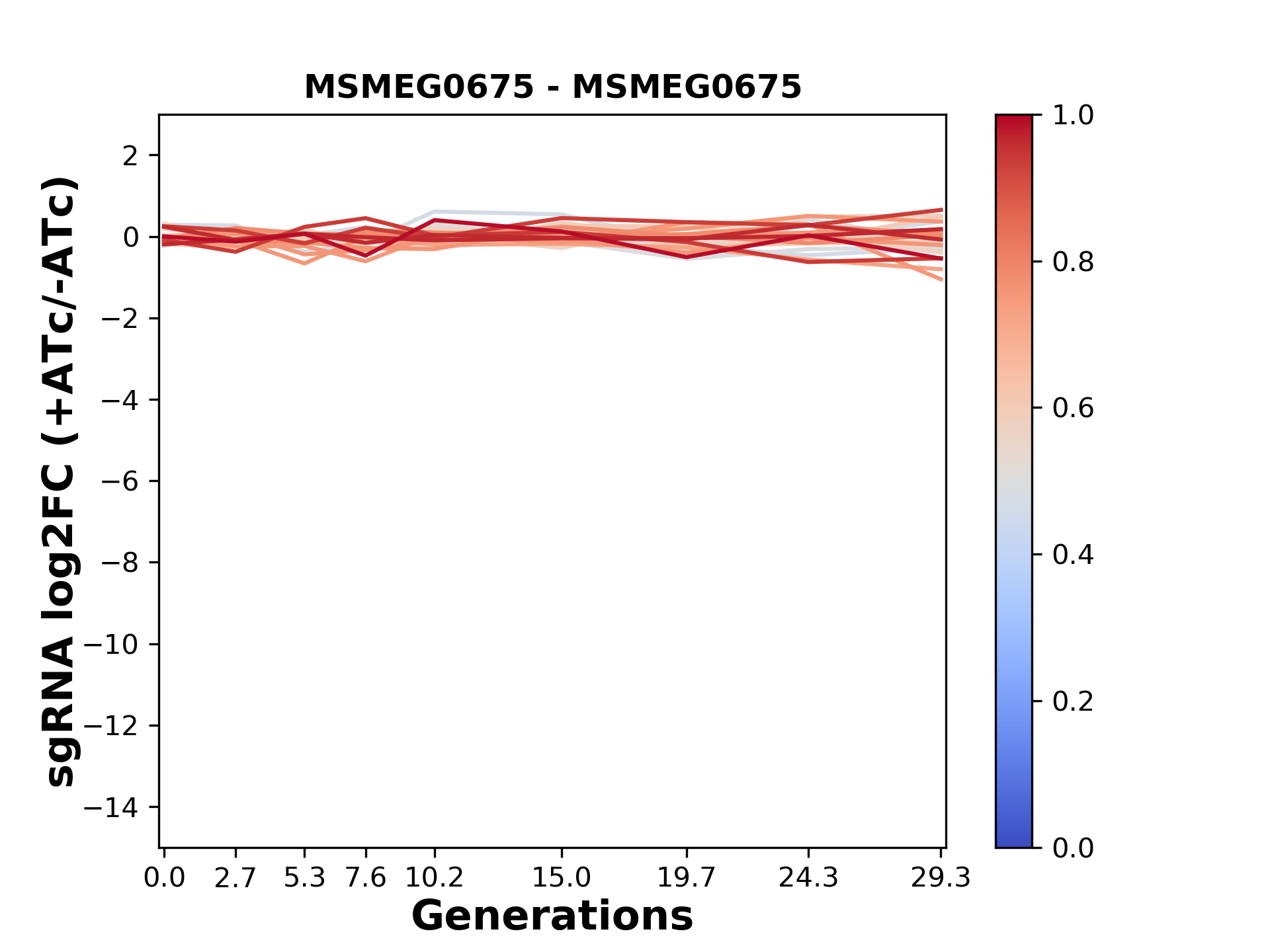 Here, we show sgRNA log2 fold-change values (L2FC) (plus versus minus ATc) over consecutive generations for sgRNAs targeting the gene you selected.