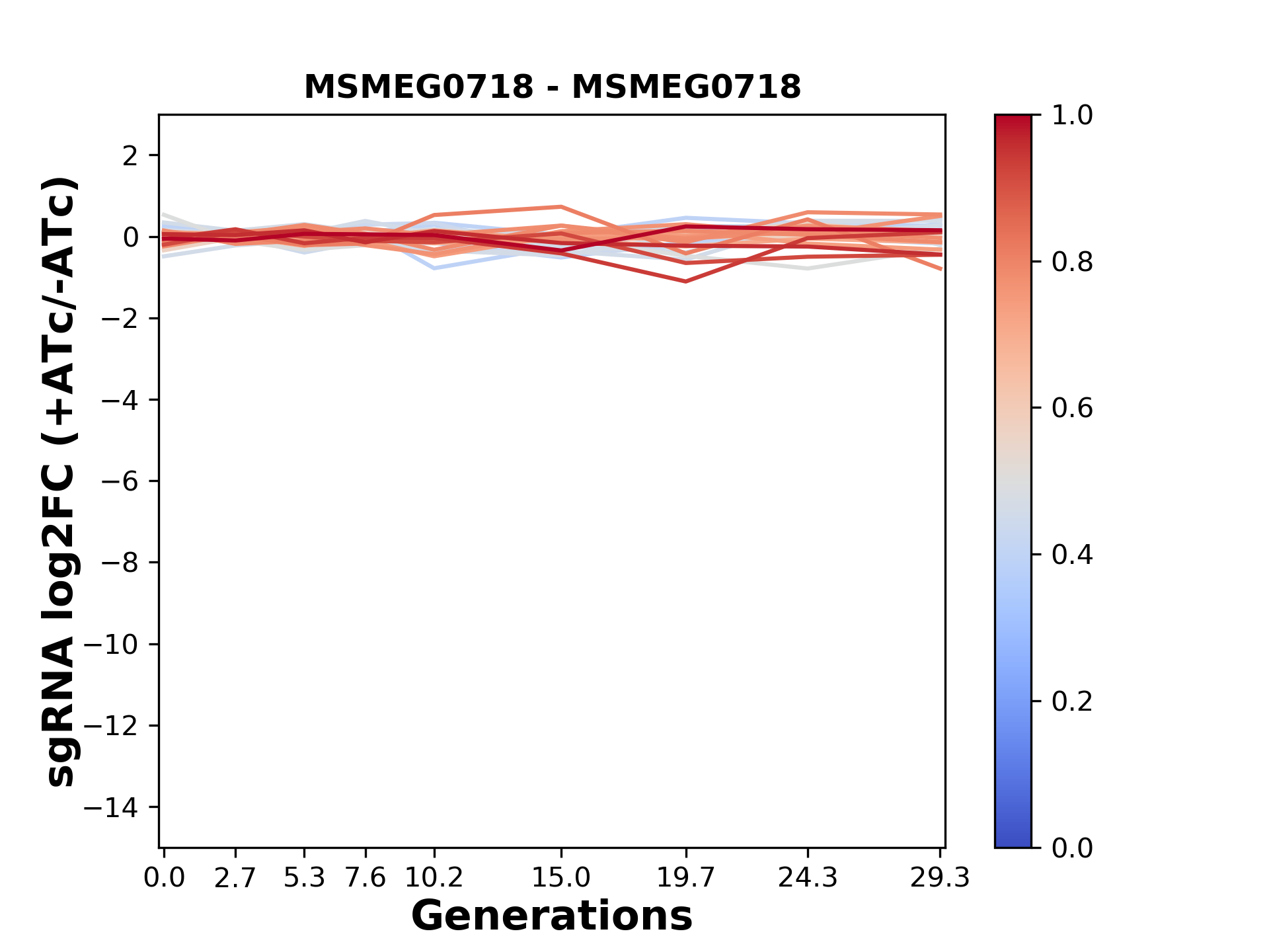 Here, we show sgRNA log2 fold-change values (L2FC) (plus versus minus ATc) over consecutive generations for sgRNAs targeting the gene you selected.