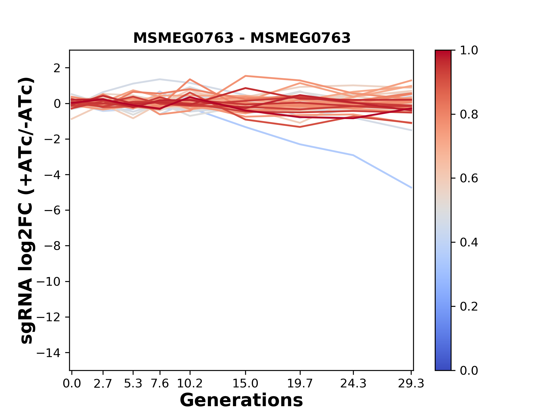 Here, we show sgRNA log2 fold-change values (L2FC) (plus versus minus ATc) over consecutive generations for sgRNAs targeting the gene you selected.