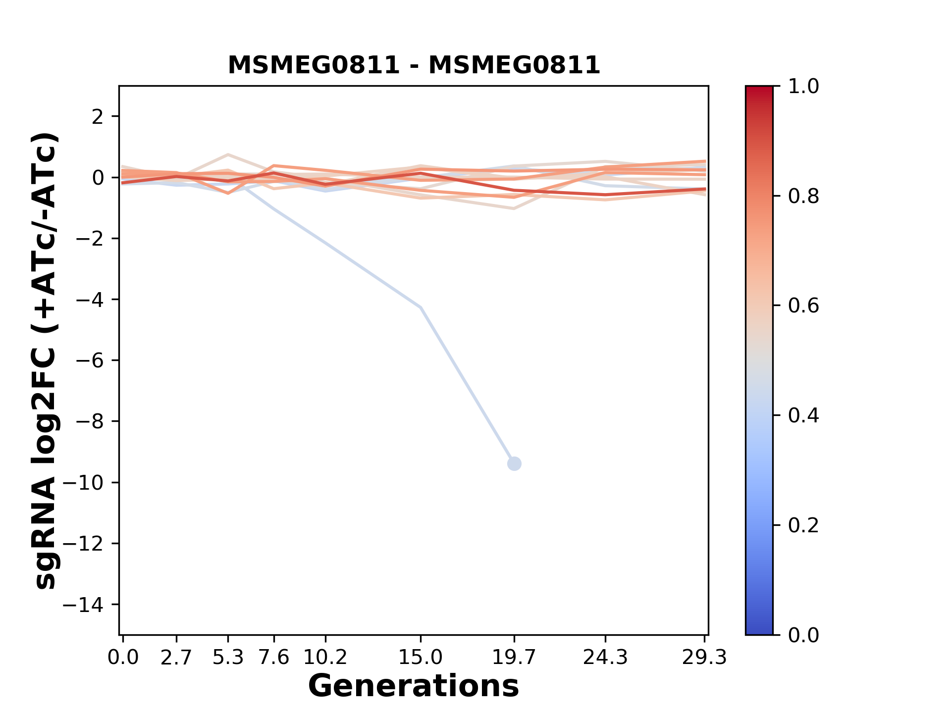 Here, we show sgRNA log2 fold-change values (L2FC) (plus versus minus ATc) over consecutive generations for sgRNAs targeting the gene you selected.