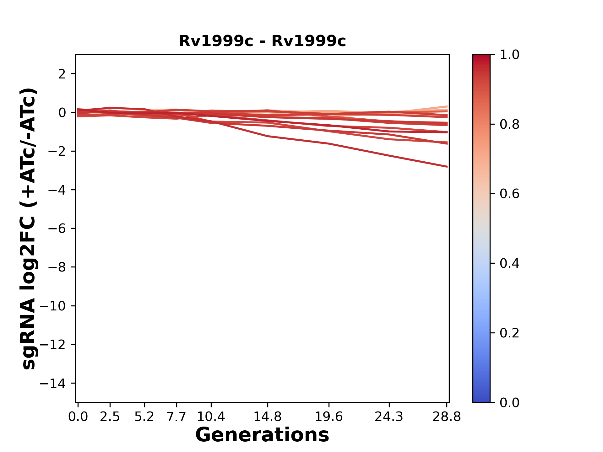 Here, we show sgRNA log2 fold-change values (L2FC) (plus versus minus ATc) over consecutive generations for sgRNAs targeting the gene you selected.