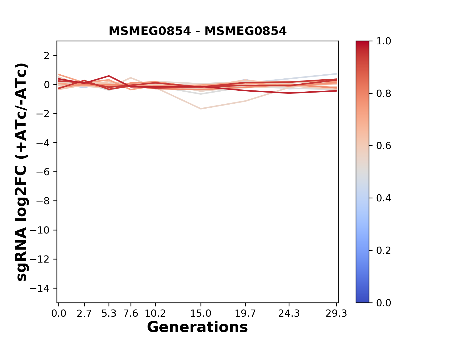 Here, we show sgRNA log2 fold-change values (L2FC) (plus versus minus ATc) over consecutive generations for sgRNAs targeting the gene you selected.