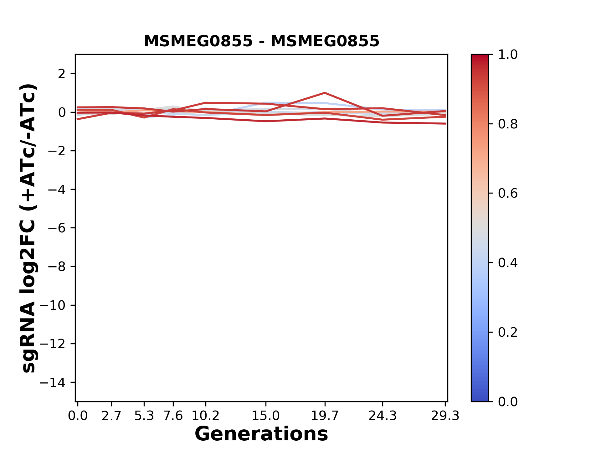 Here, we show sgRNA log2 fold-change values (L2FC) (plus versus minus ATc) over consecutive generations for sgRNAs targeting the gene you selected.