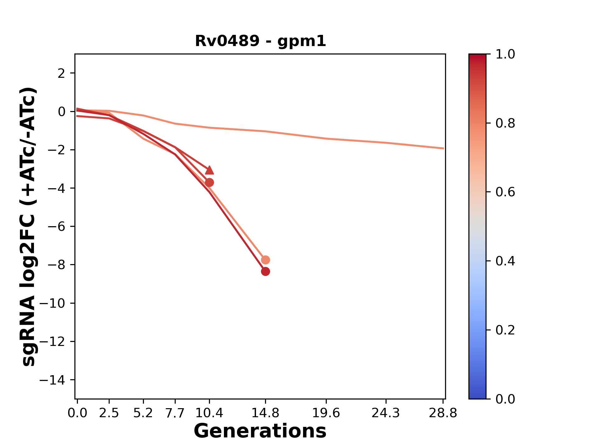 Here, we show sgRNA log2 fold-change values (L2FC) (plus versus minus ATc) over consecutive generations for sgRNAs targeting the gene you selected.