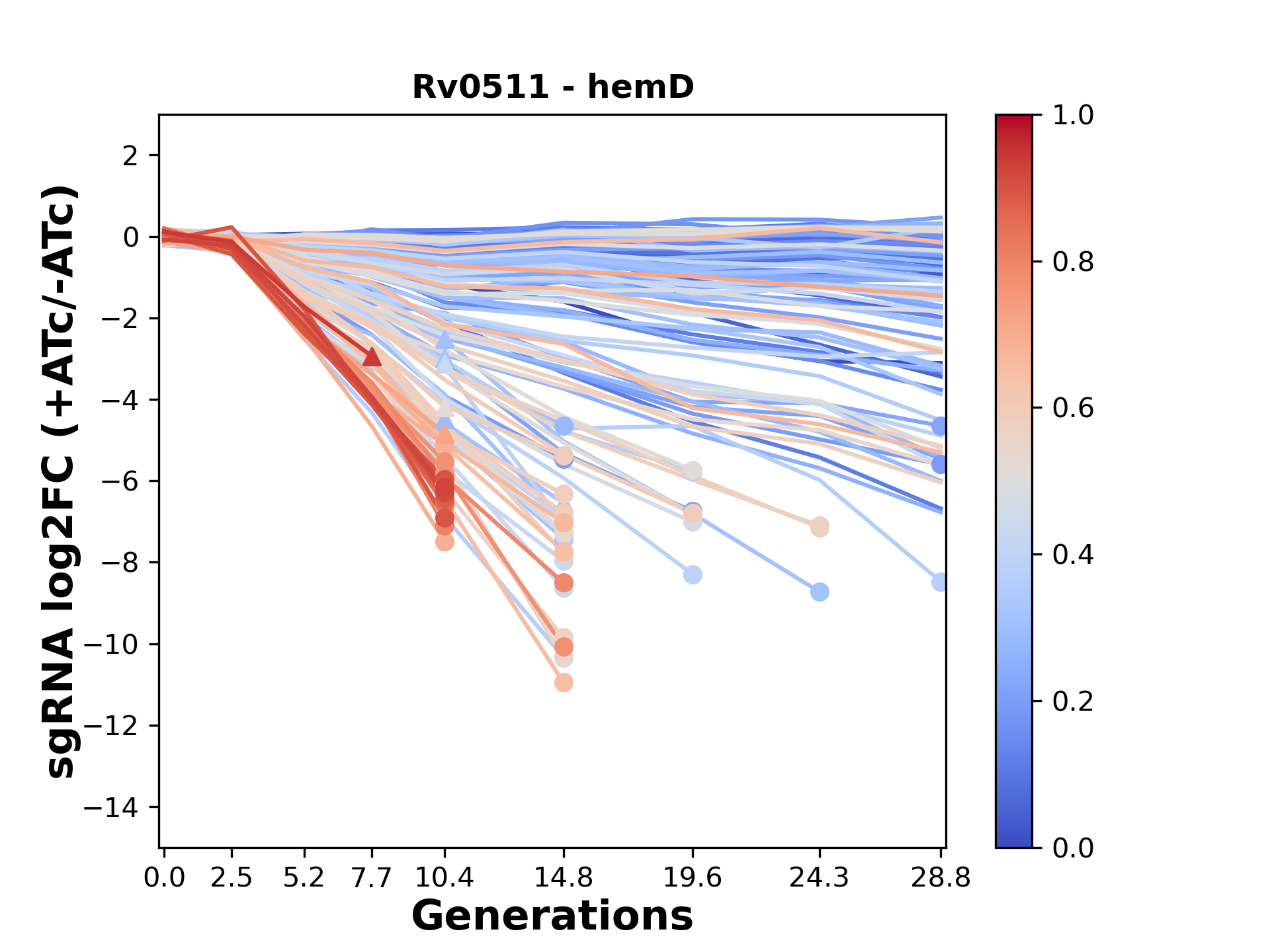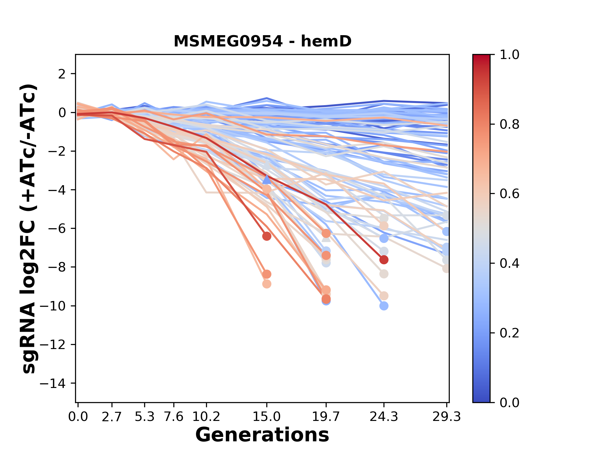Here, we show sgRNA log2 fold-change values (L2FC) (plus versus minus ATc) over consecutive generations for sgRNAs targeting the gene you selected.