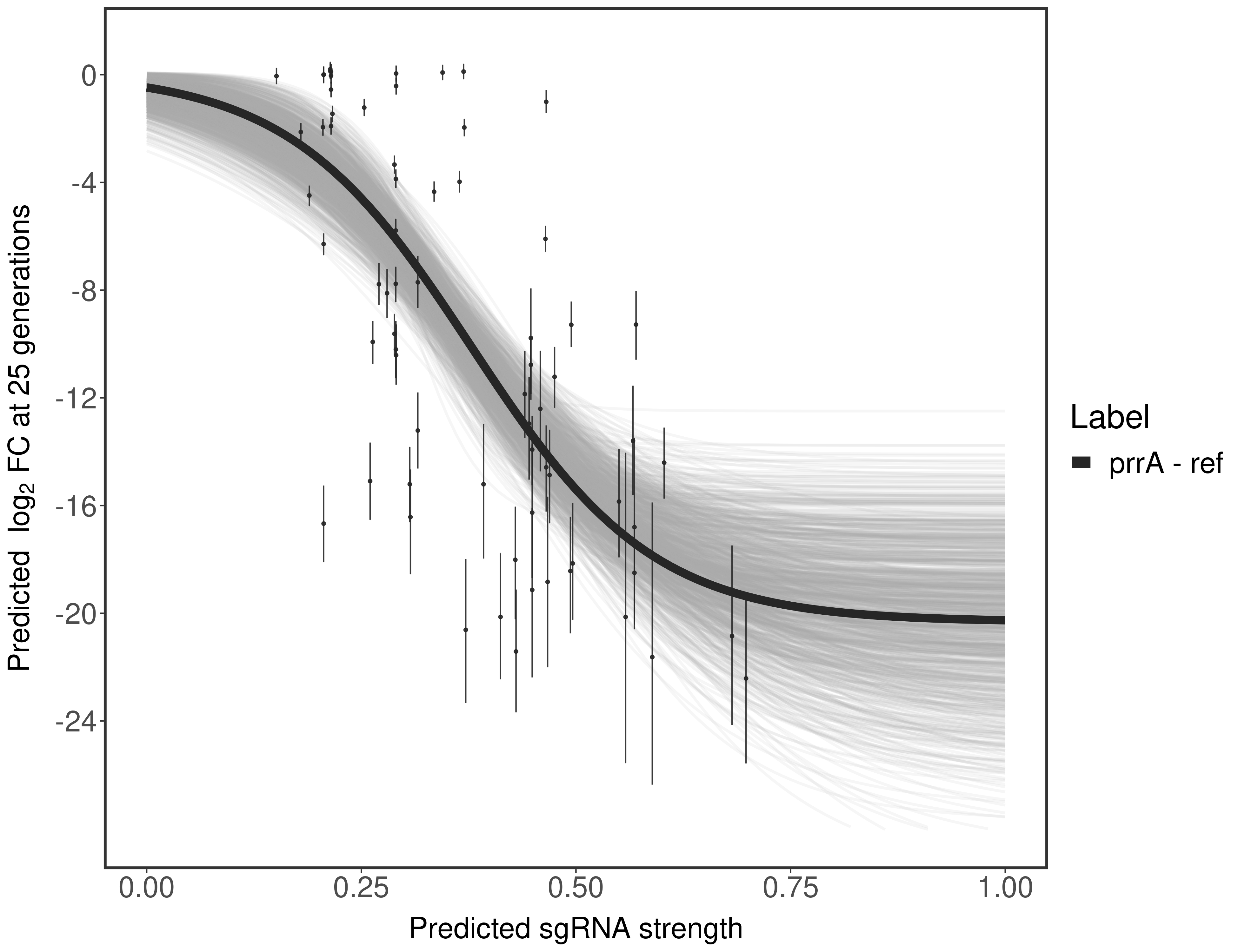 Here, we show sgRNA log2 fold-change values (L2FC) (plus versus minus ATc) over consecutive generations for sgRNAs targeting the gene you selected.