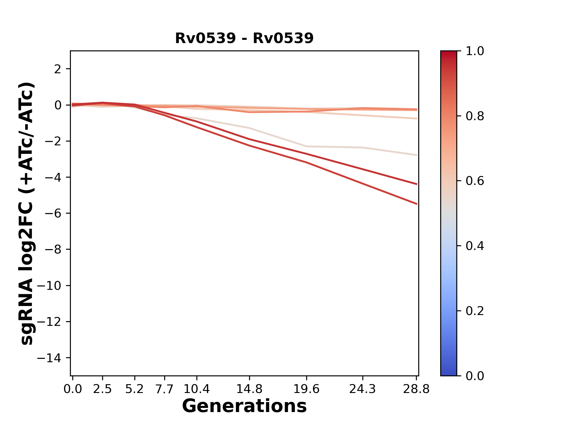 Here, we show sgRNA log2 fold-change values (L2FC) (plus versus minus ATc) over consecutive generations for sgRNAs targeting the gene you selected.