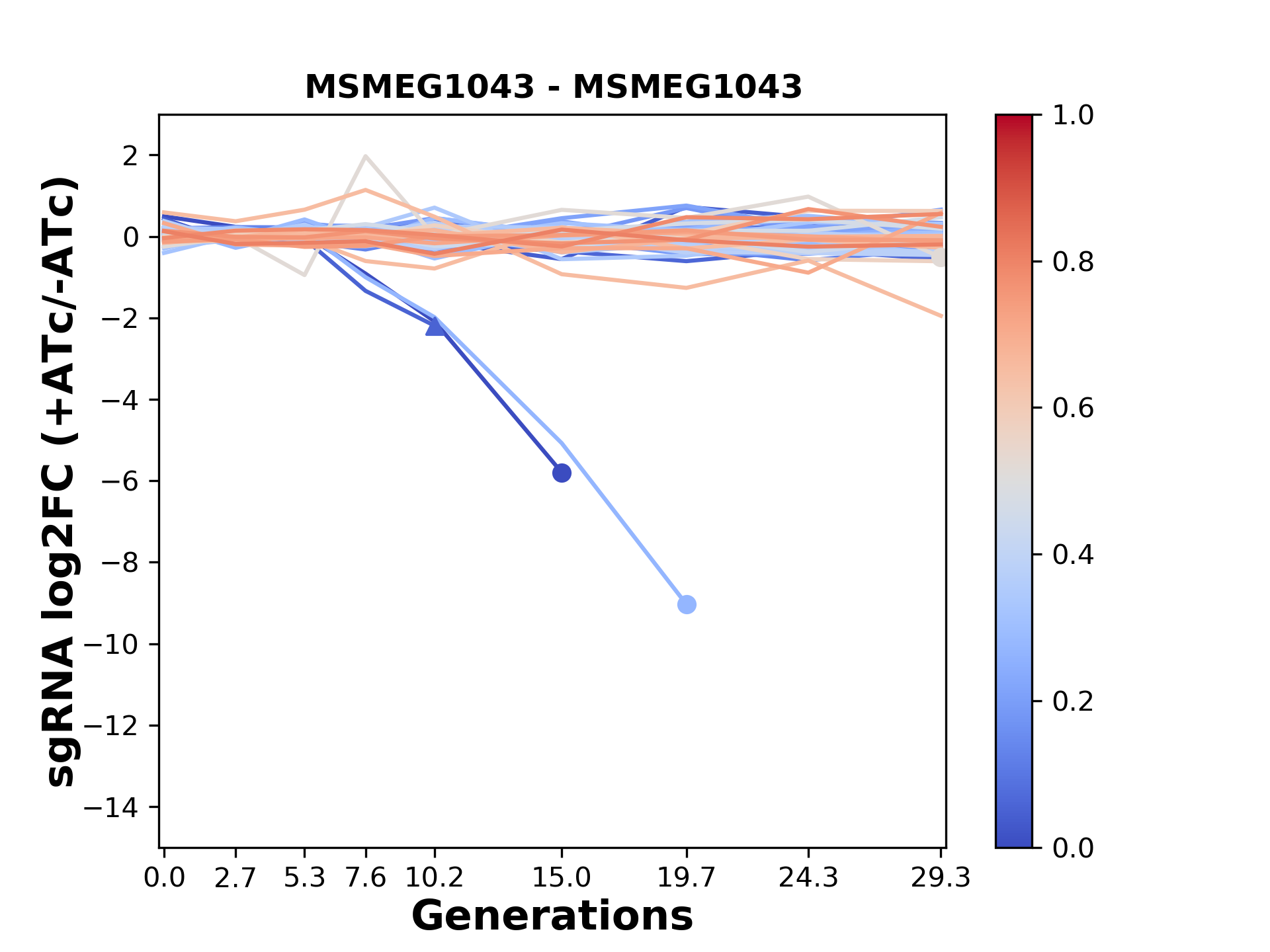 Here, we show sgRNA log2 fold-change values (L2FC) (plus versus minus ATc) over consecutive generations for sgRNAs targeting the gene you selected.
