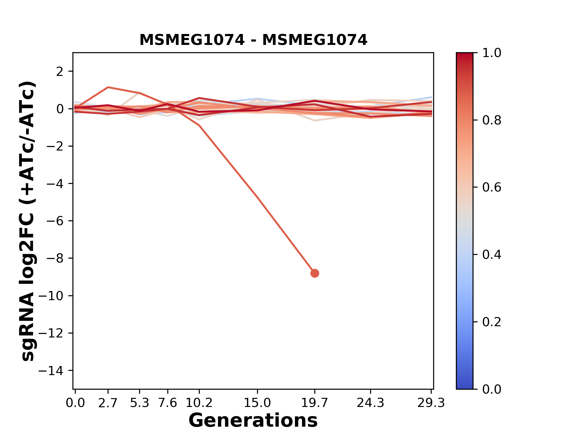 Here, we show sgRNA log2 fold-change values (L2FC) (plus versus minus ATc) over consecutive generations for sgRNAs targeting the gene you selected.