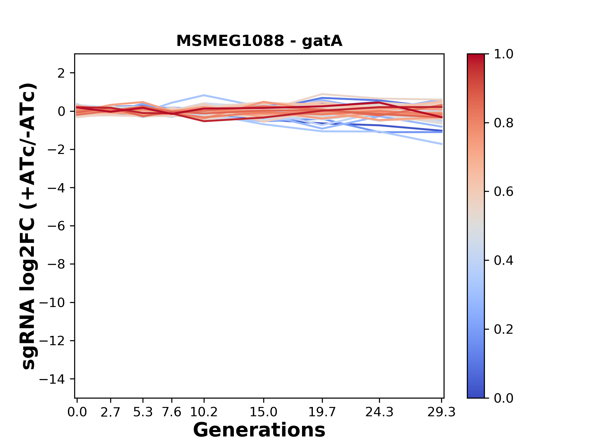 Here, we show sgRNA log2 fold-change values (L2FC) (plus versus minus ATc) over consecutive generations for sgRNAs targeting the gene you selected.