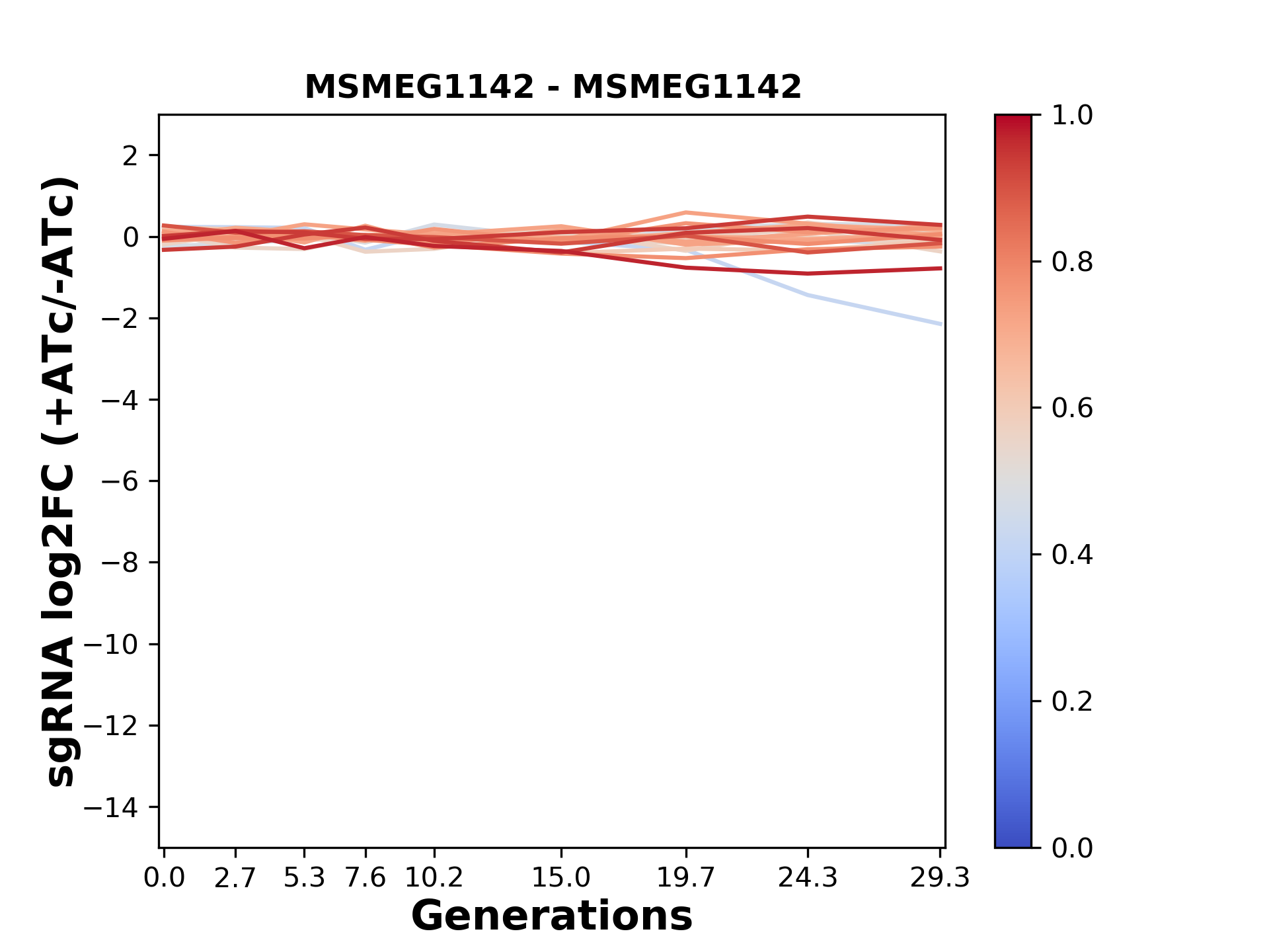 Here, we show sgRNA log2 fold-change values (L2FC) (plus versus minus ATc) over consecutive generations for sgRNAs targeting the gene you selected.