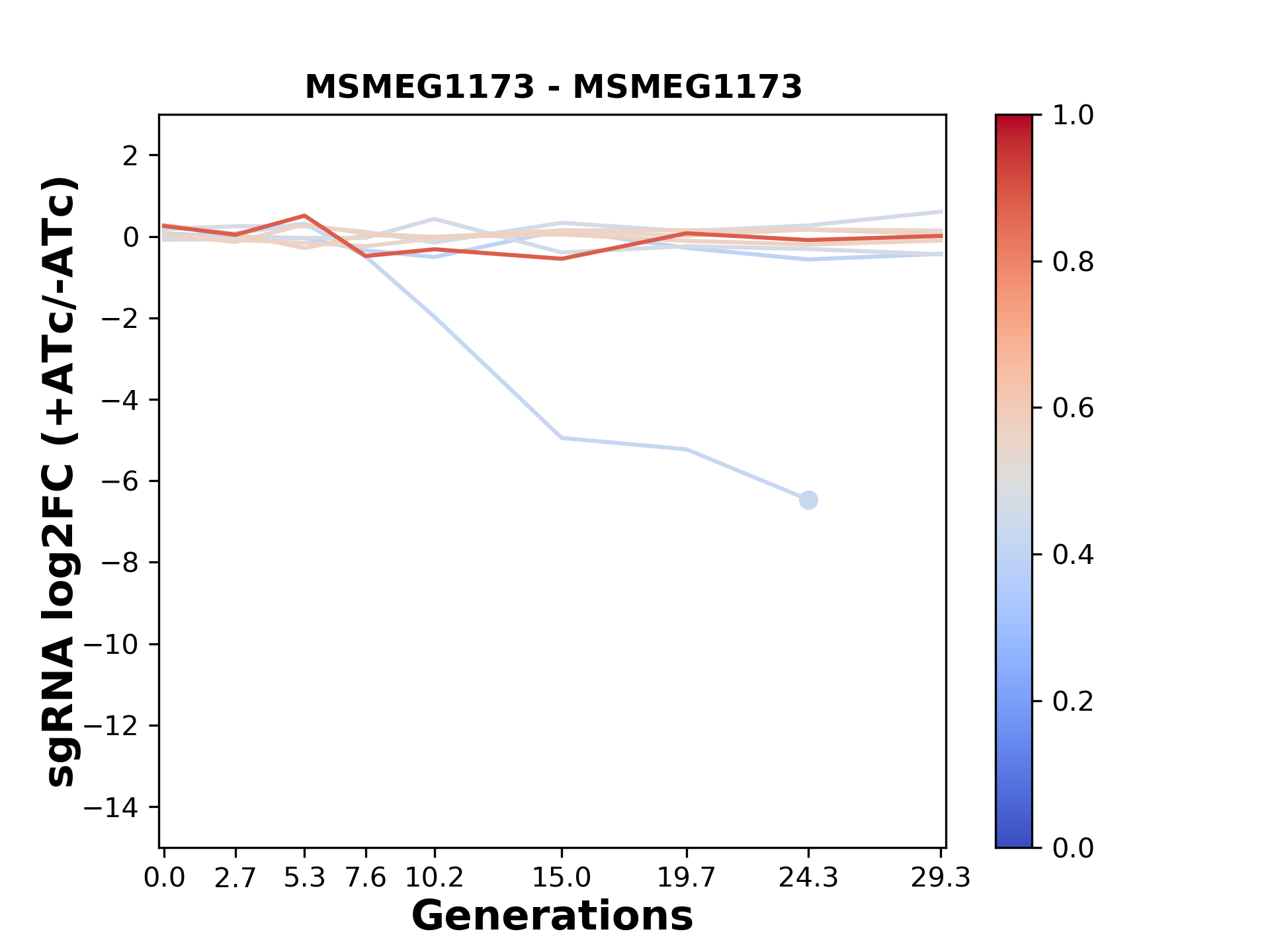 Here, we show sgRNA log2 fold-change values (L2FC) (plus versus minus ATc) over consecutive generations for sgRNAs targeting the gene you selected.