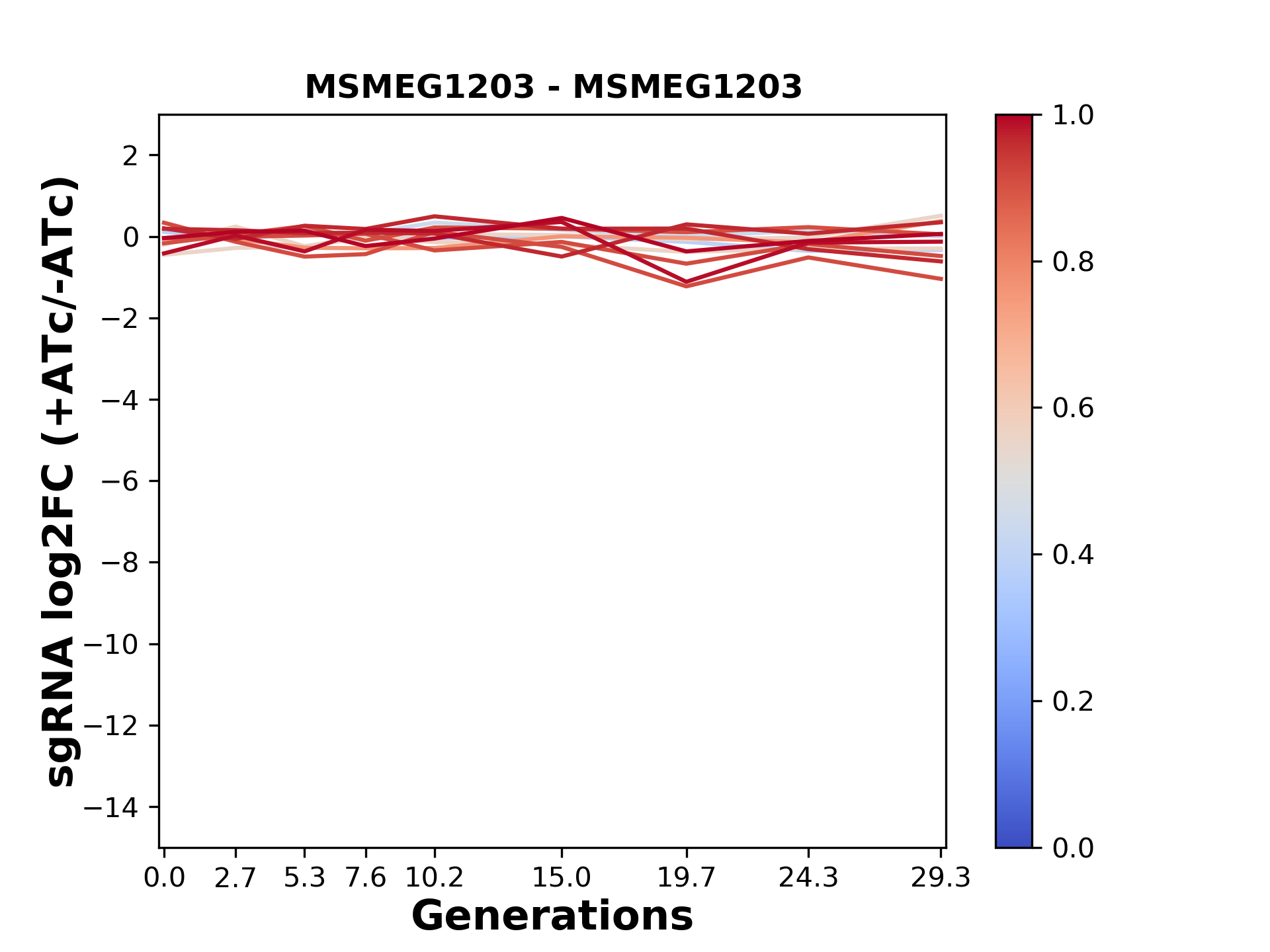 Here, we show sgRNA log2 fold-change values (L2FC) (plus versus minus ATc) over consecutive generations for sgRNAs targeting the gene you selected.