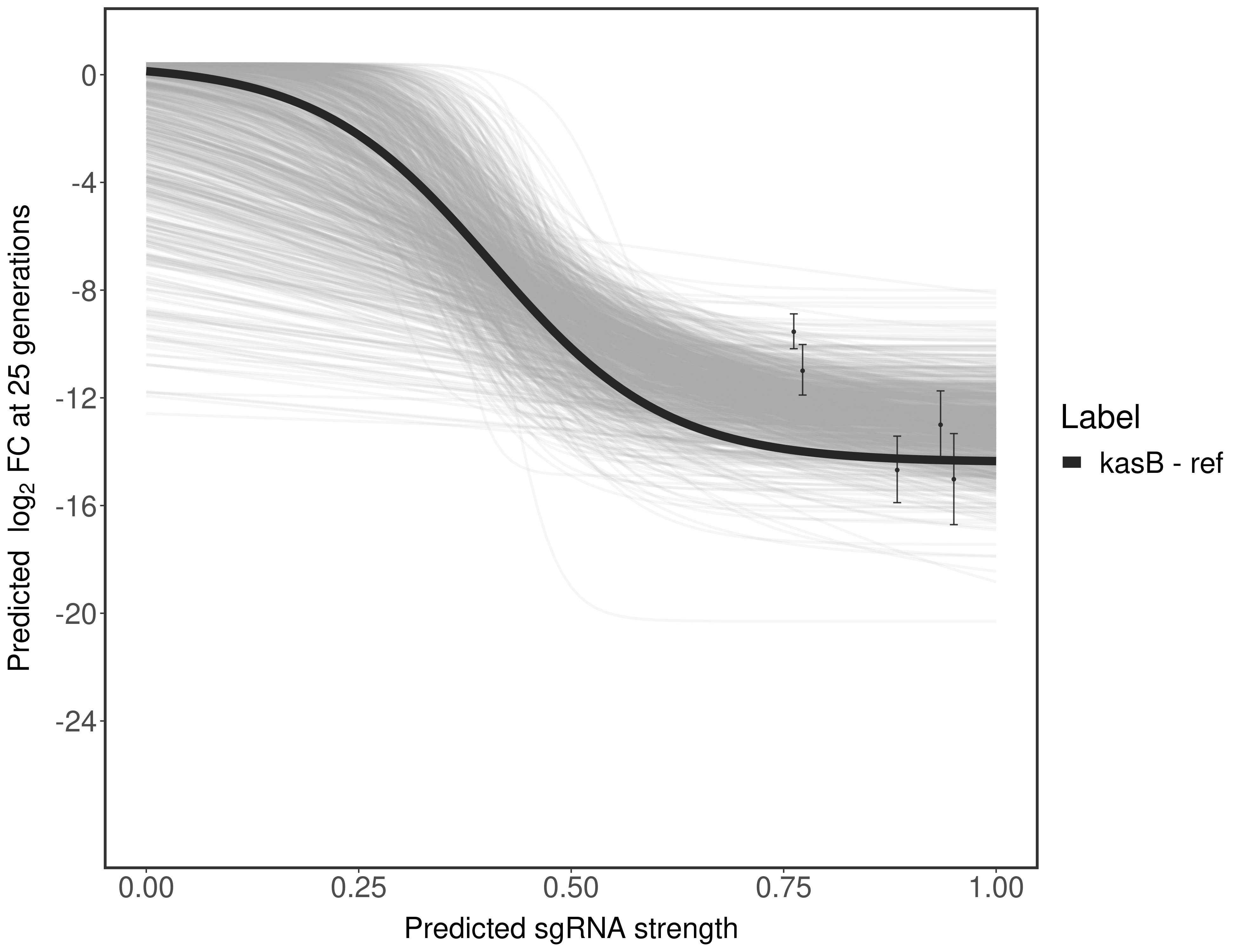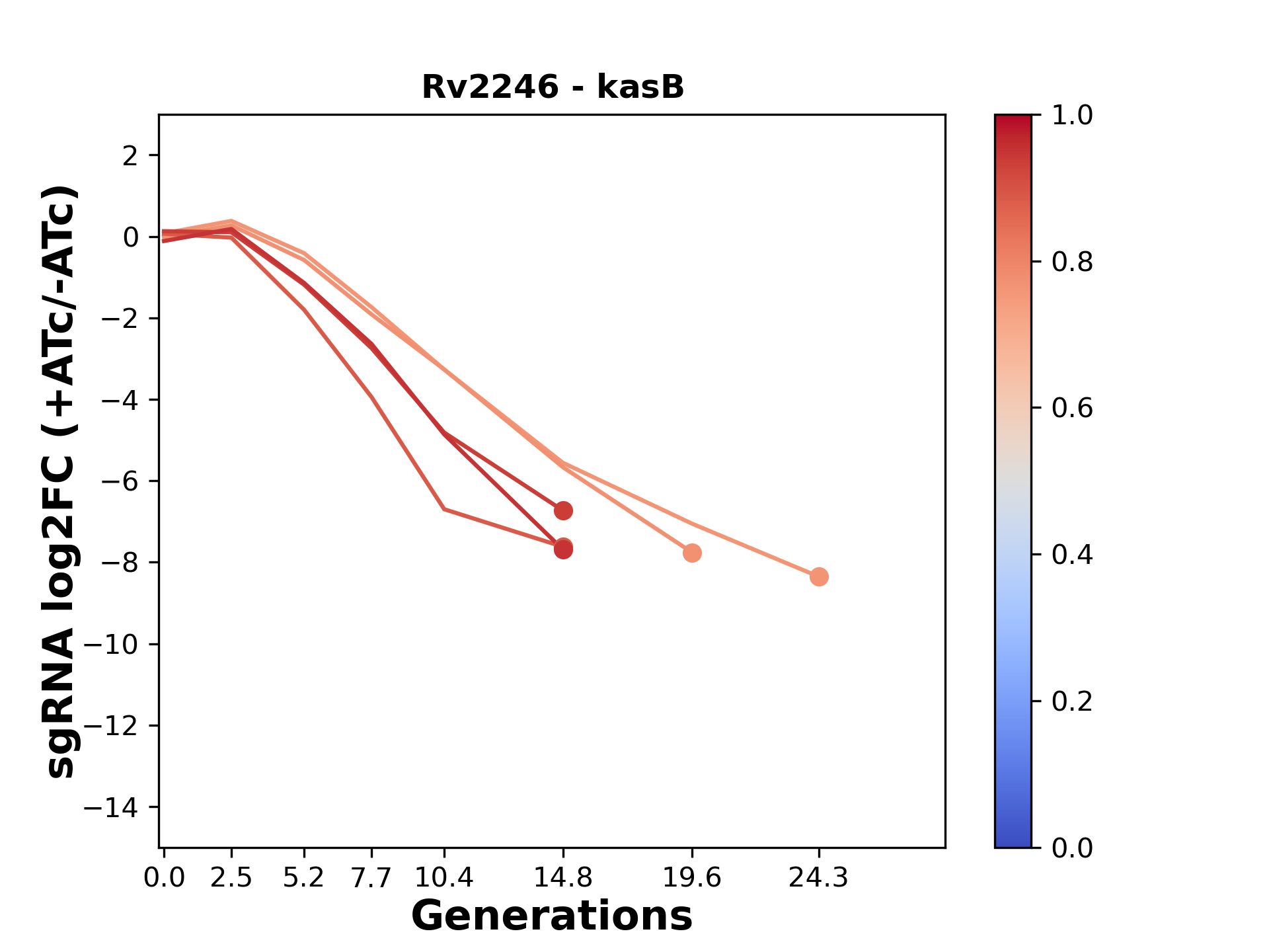 Here, we show sgRNA log2 fold-change values (L2FC) (plus versus minus ATc) over consecutive generations for sgRNAs targeting the gene you selected.