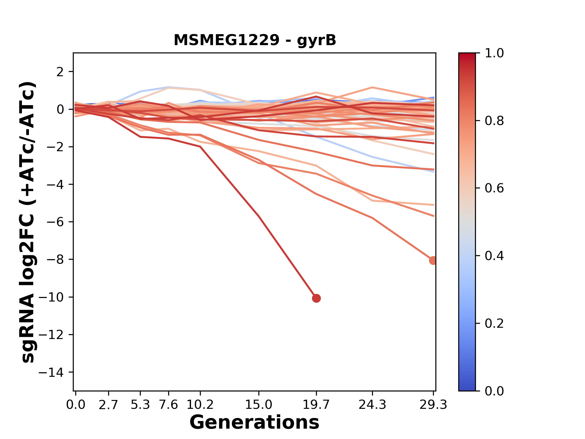 Here, we show sgRNA log2 fold-change values (L2FC) (plus versus minus ATc) over consecutive generations for sgRNAs targeting the gene you selected.