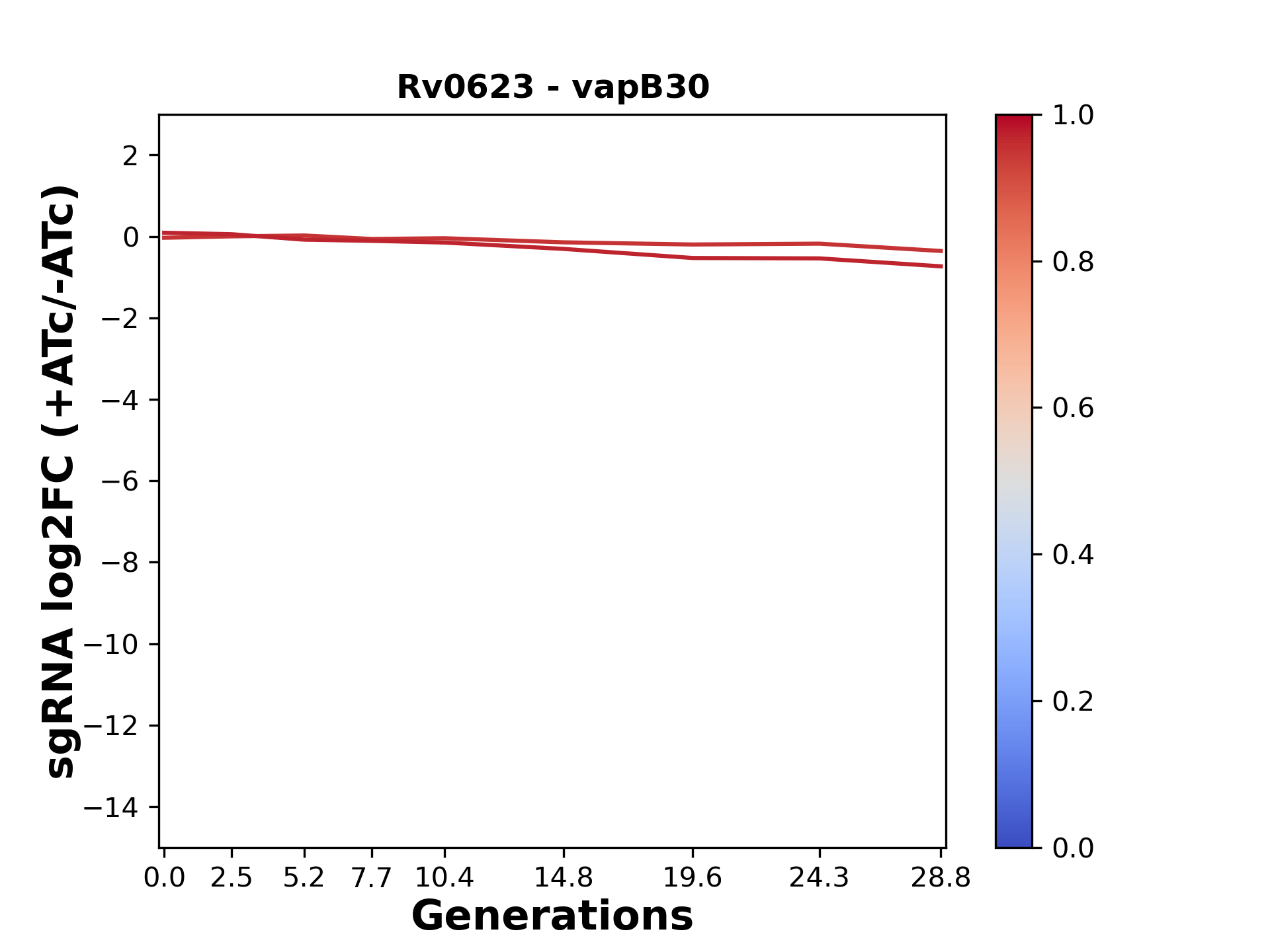 Here, we show sgRNA log2 fold-change values (L2FC) (plus versus minus ATc) over consecutive generations for sgRNAs targeting the gene you selected.