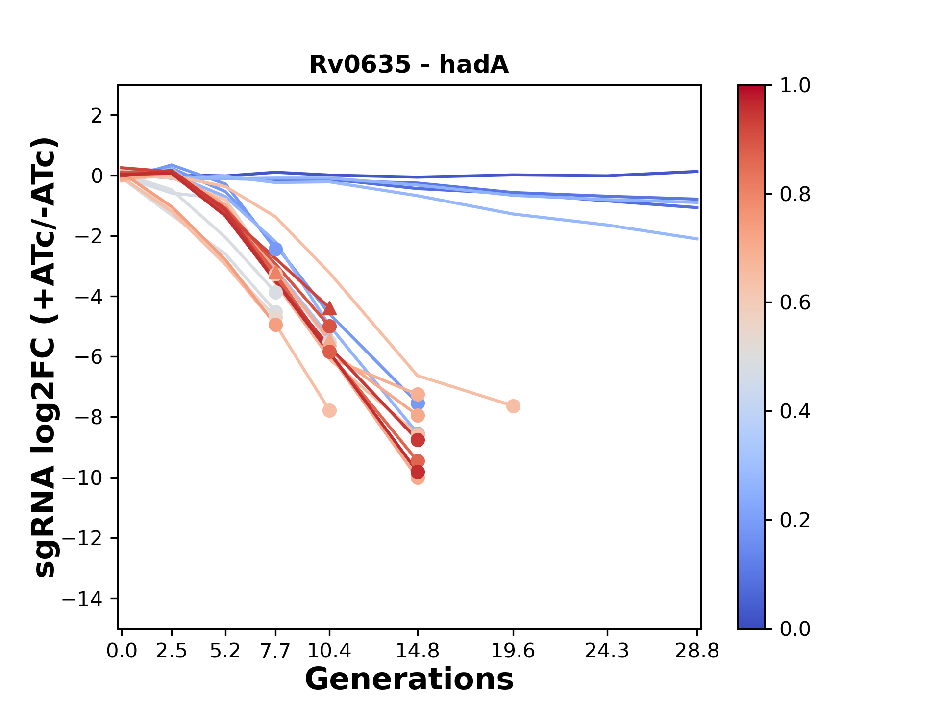 Here, we show sgRNA log2 fold-change values (L2FC) (plus versus minus ATc) over consecutive generations for sgRNAs targeting the gene you selected.