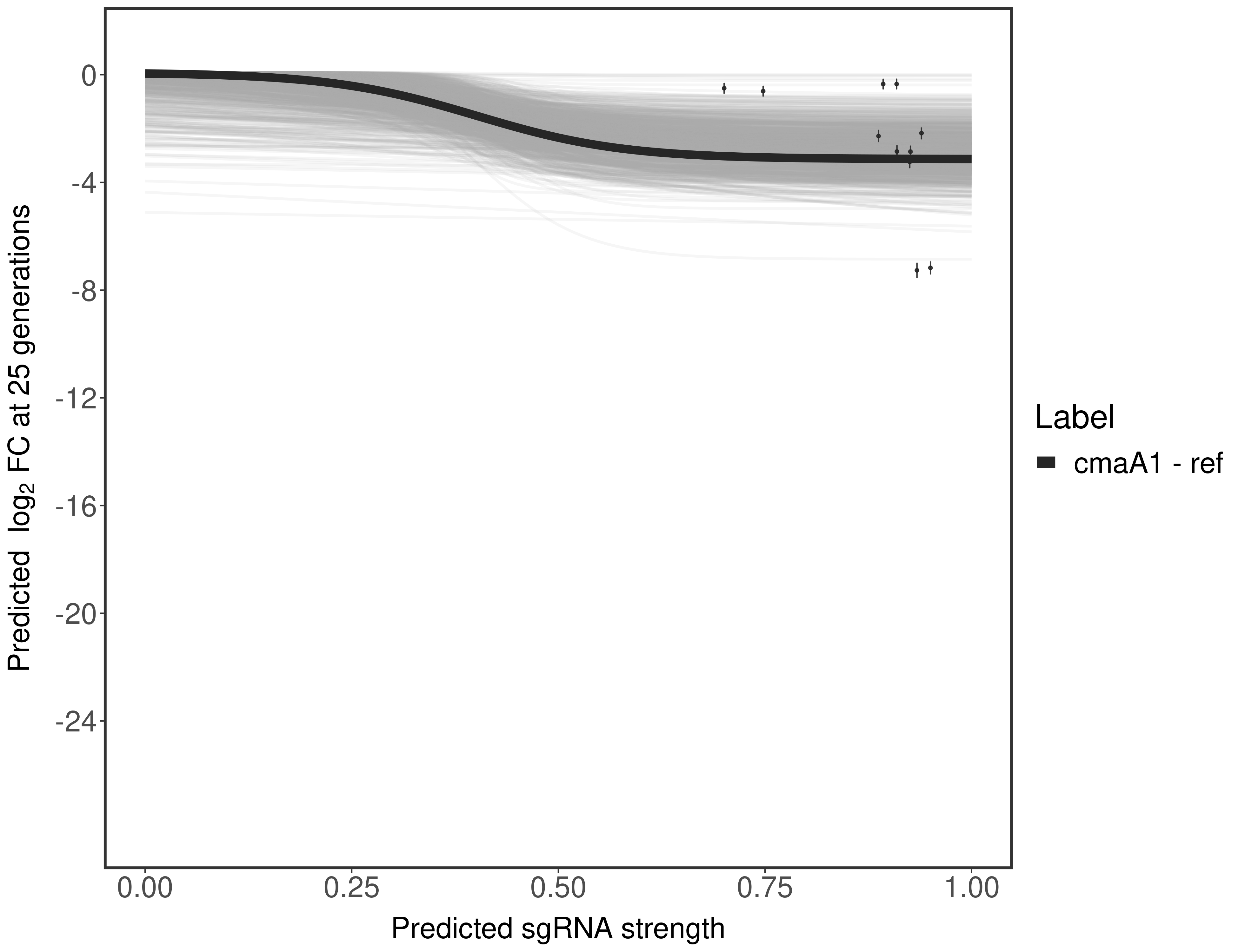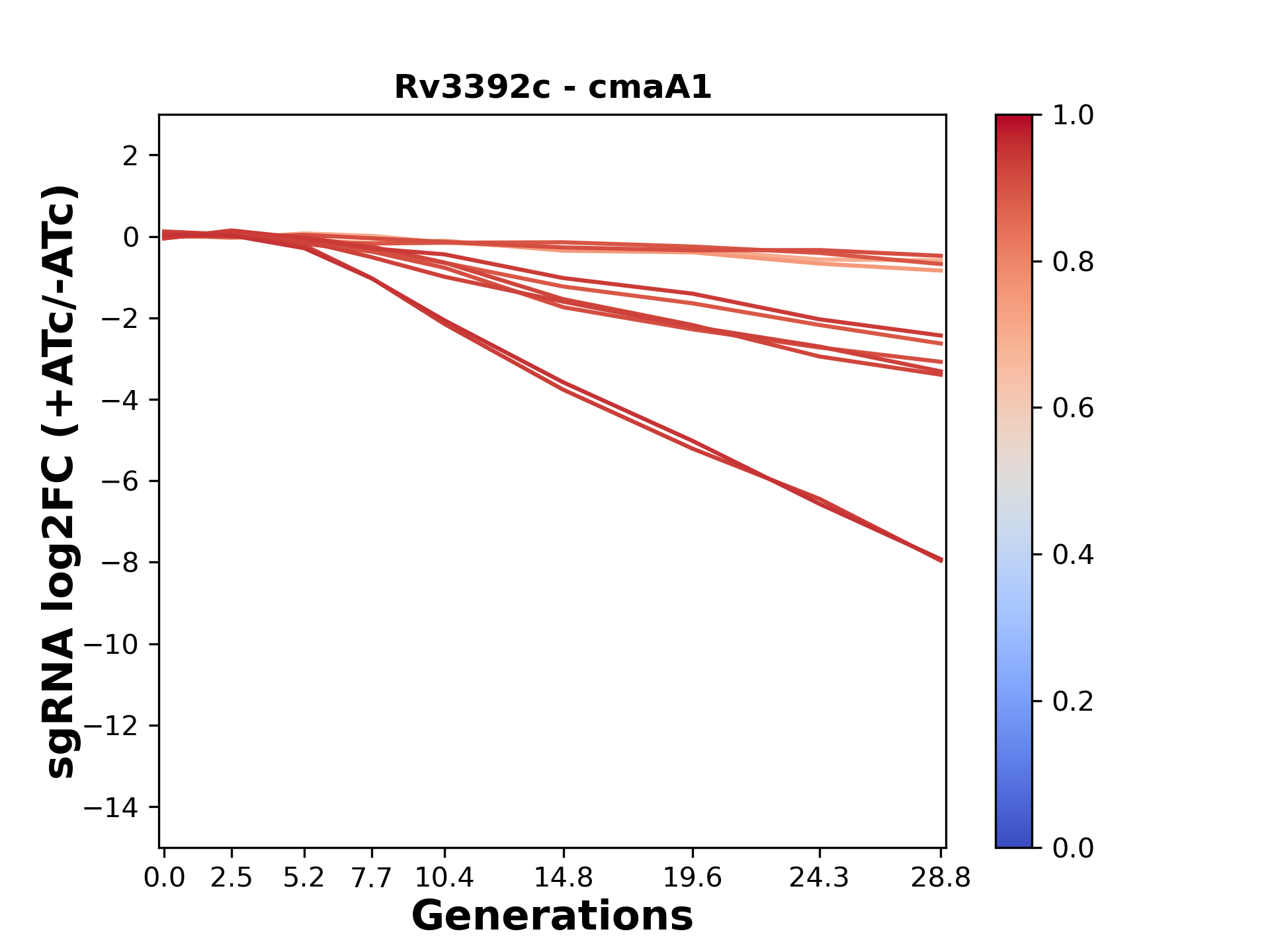 Here, we show sgRNA log2 fold-change values (L2FC) (plus versus minus ATc) over consecutive generations for sgRNAs targeting the gene you selected.
