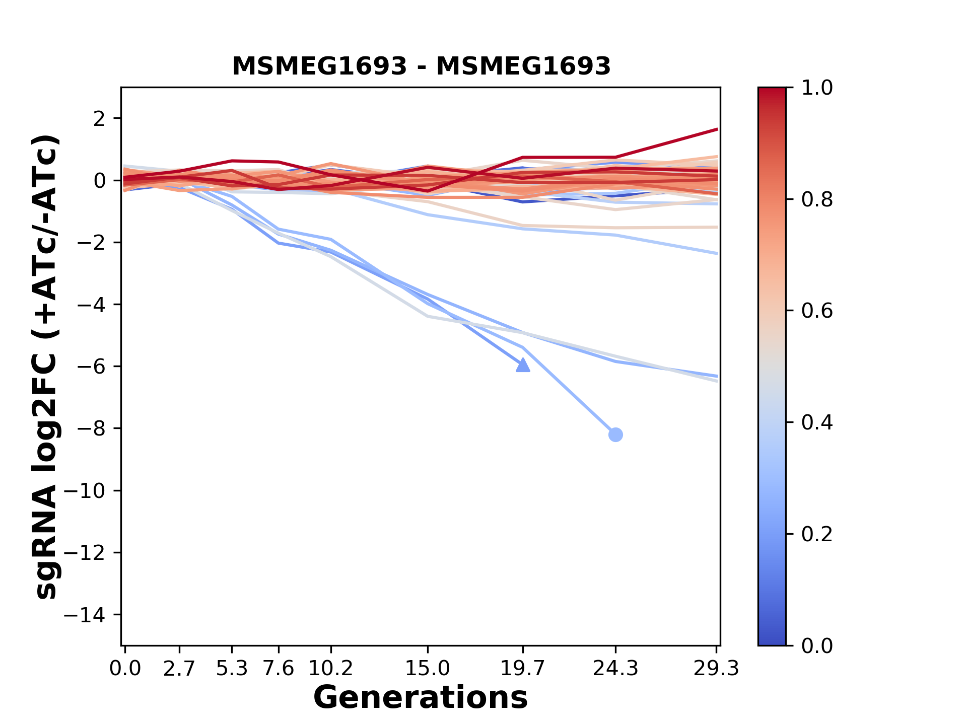Here, we show sgRNA log2 fold-change values (L2FC) (plus versus minus ATc) over consecutive generations for sgRNAs targeting the gene you selected.