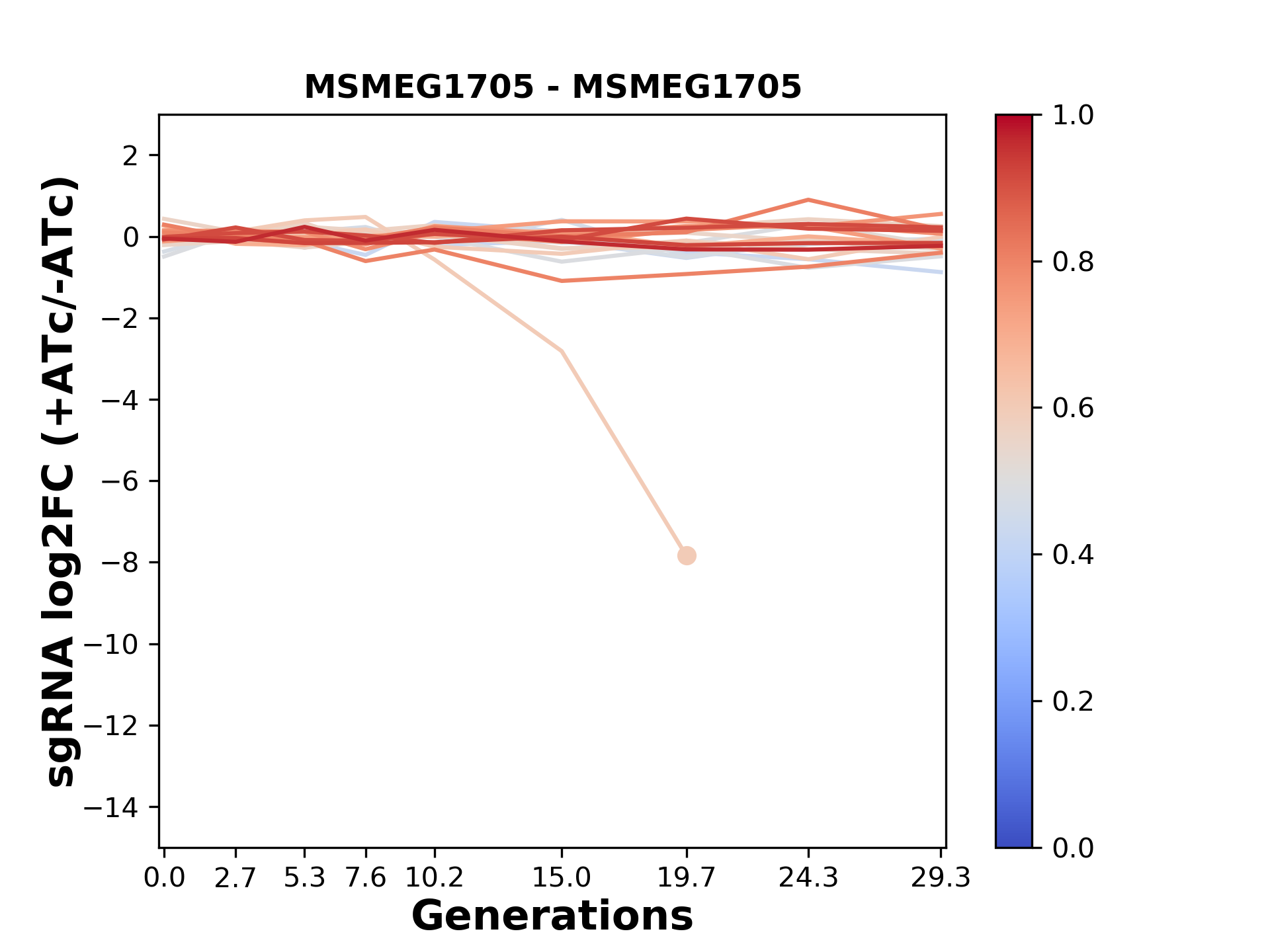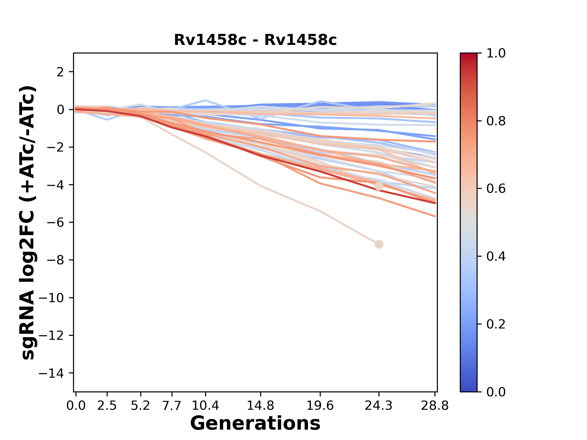 Here, we show sgRNA log2 fold-change values (L2FC) (plus versus minus ATc) over consecutive generations for sgRNAs targeting the gene you selected.