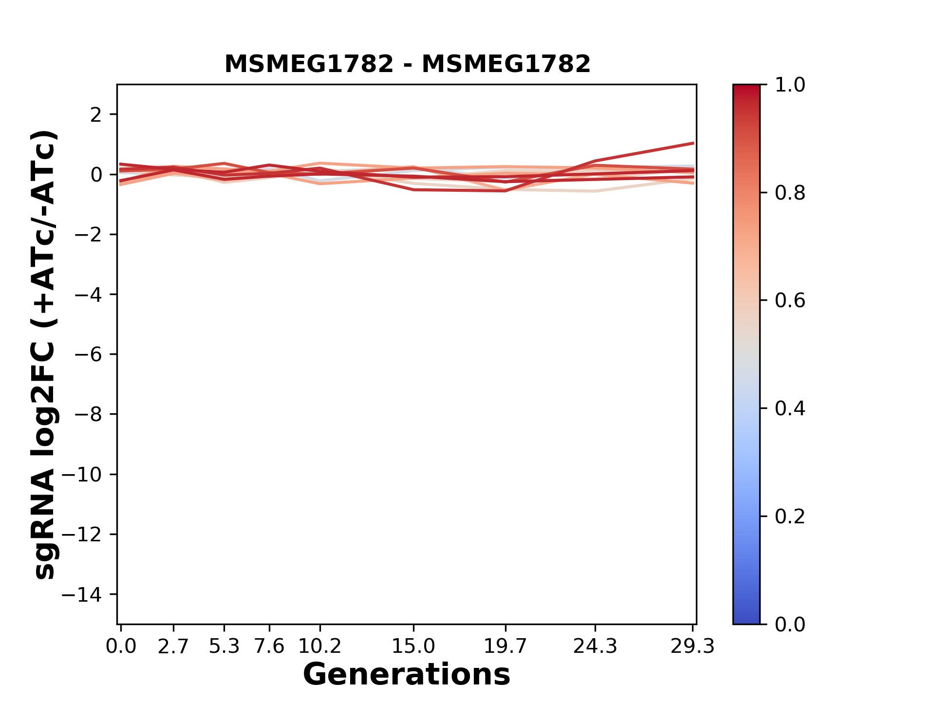 Here, we show sgRNA log2 fold-change values (L2FC) (plus versus minus ATc) over consecutive generations for sgRNAs targeting the gene you selected.