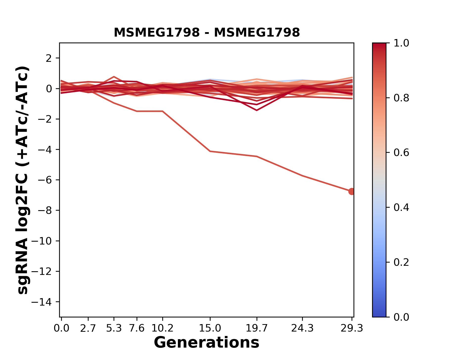 Here, we show sgRNA log2 fold-change values (L2FC) (plus versus minus ATc) over consecutive generations for sgRNAs targeting the gene you selected.