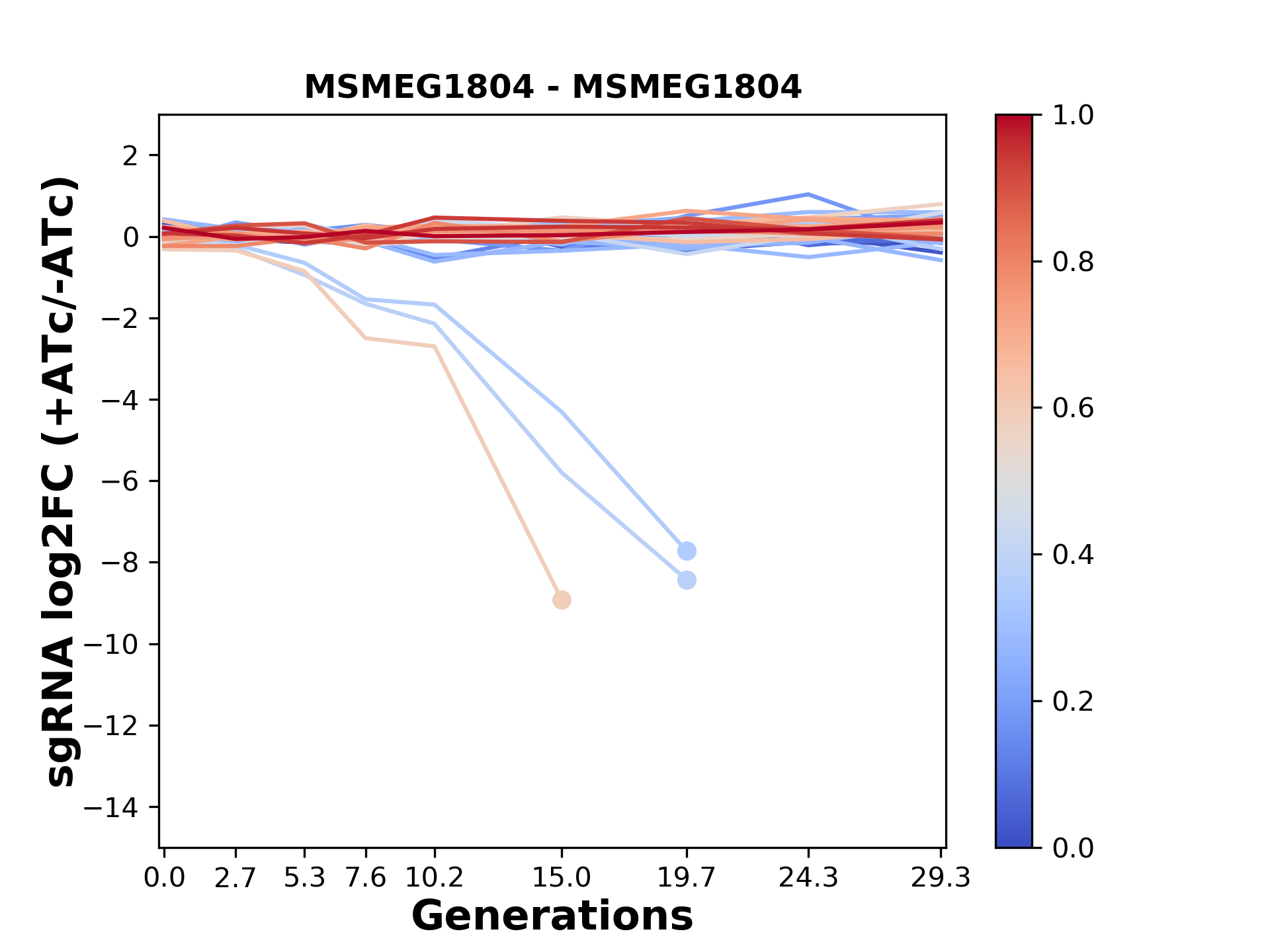 Here, we show sgRNA log2 fold-change values (L2FC) (plus versus minus ATc) over consecutive generations for sgRNAs targeting the gene you selected.