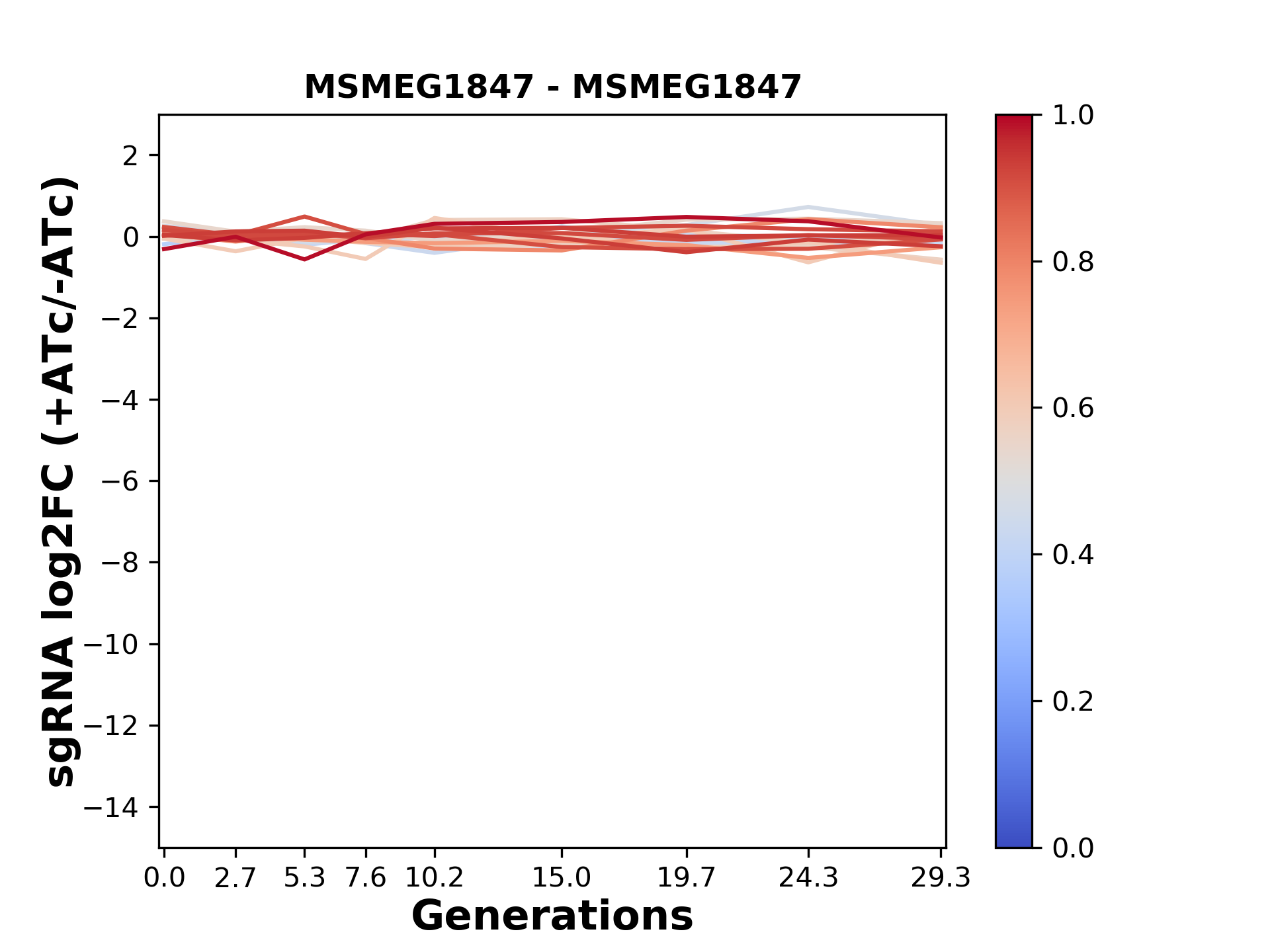 Here, we show sgRNA log2 fold-change values (L2FC) (plus versus minus ATc) over consecutive generations for sgRNAs targeting the gene you selected.