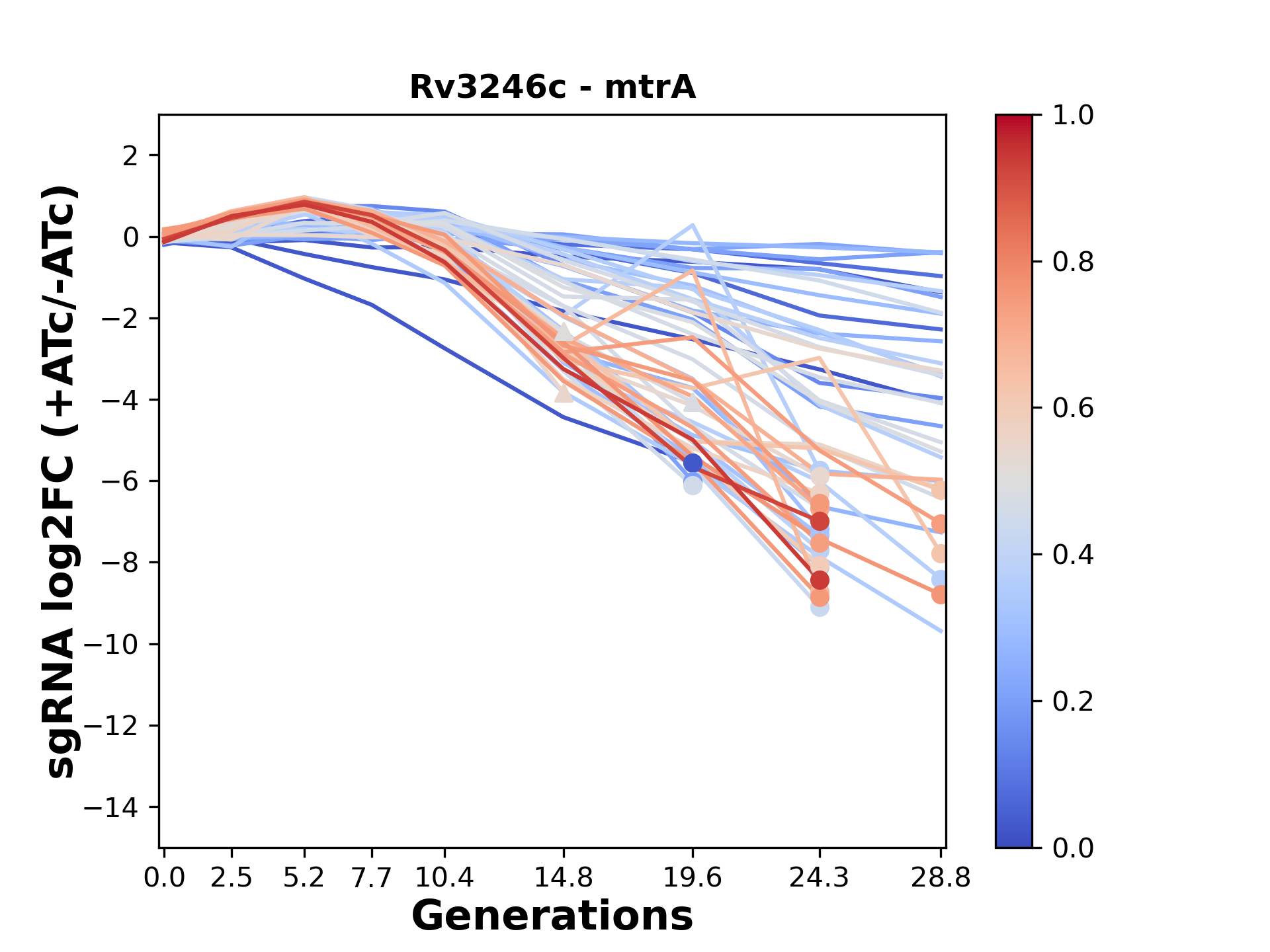 Here, we show sgRNA log2 fold-change values (L2FC) (plus versus minus ATc) over consecutive generations for sgRNAs targeting the gene you selected.