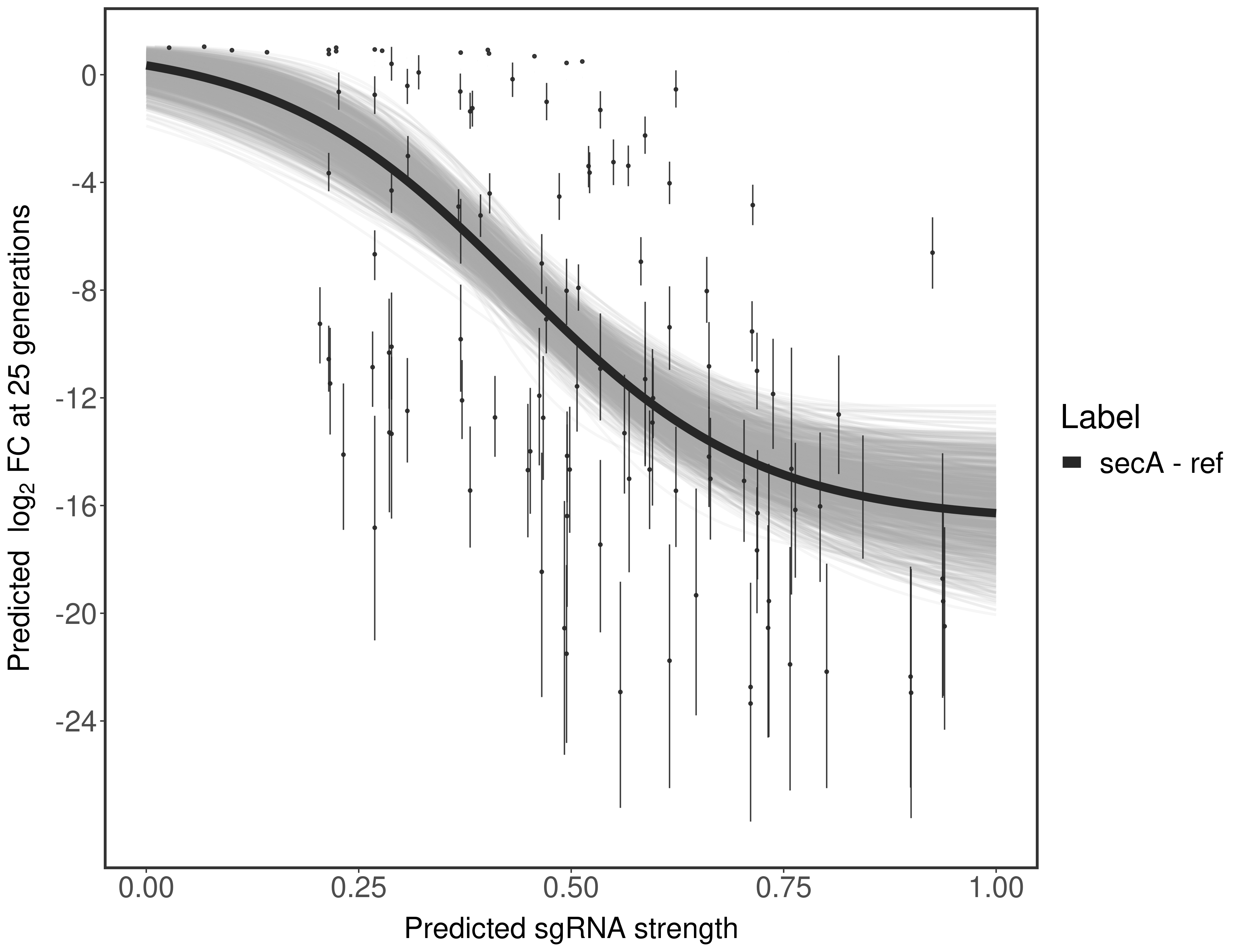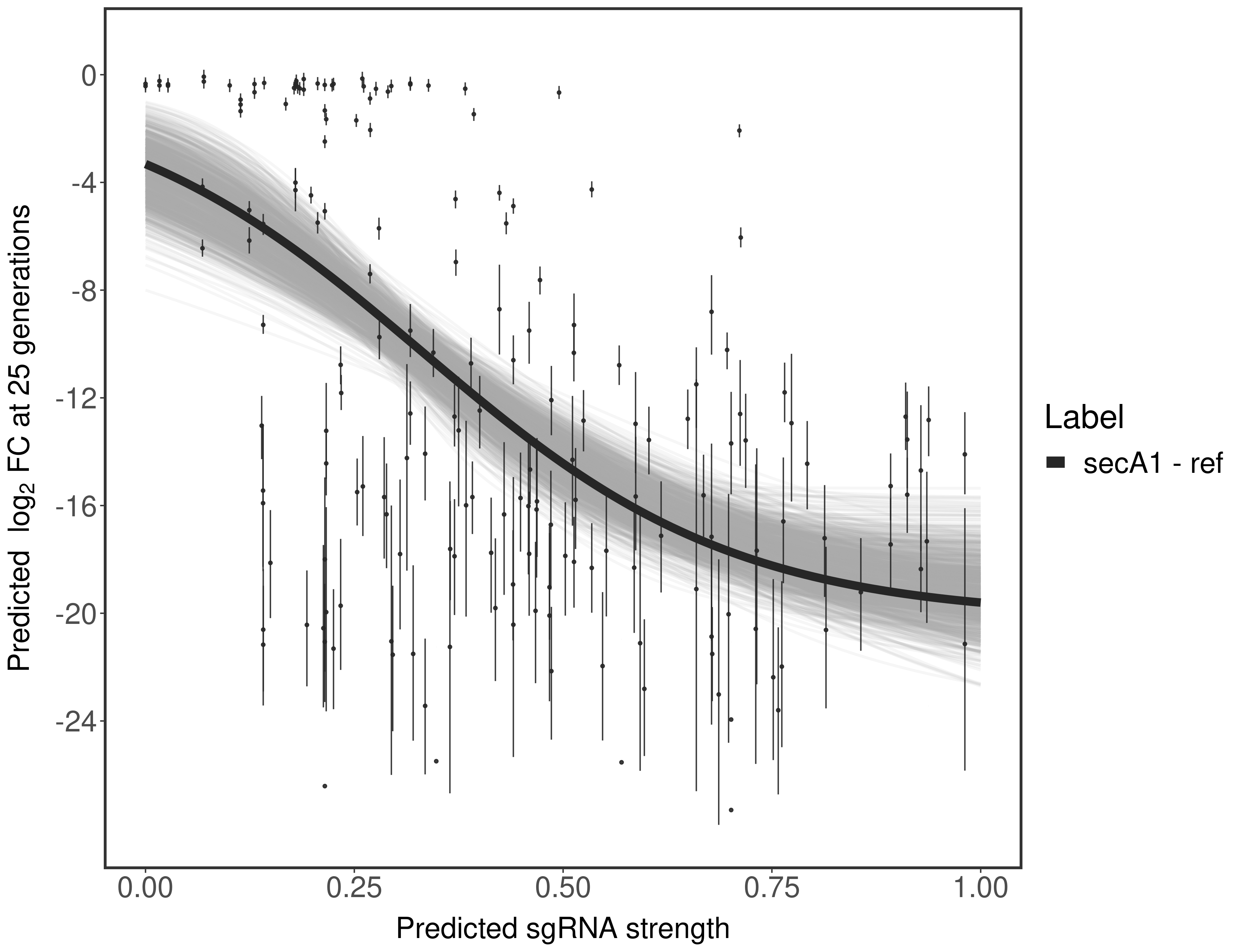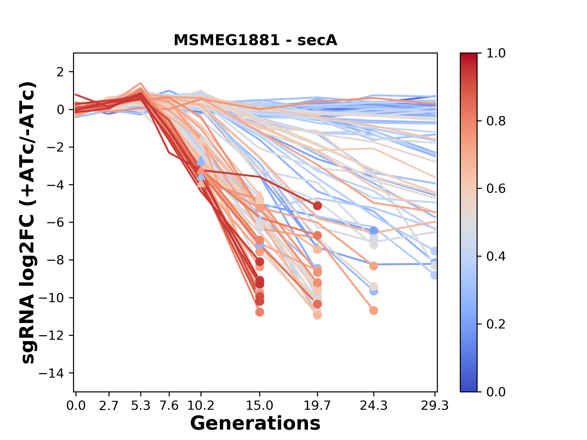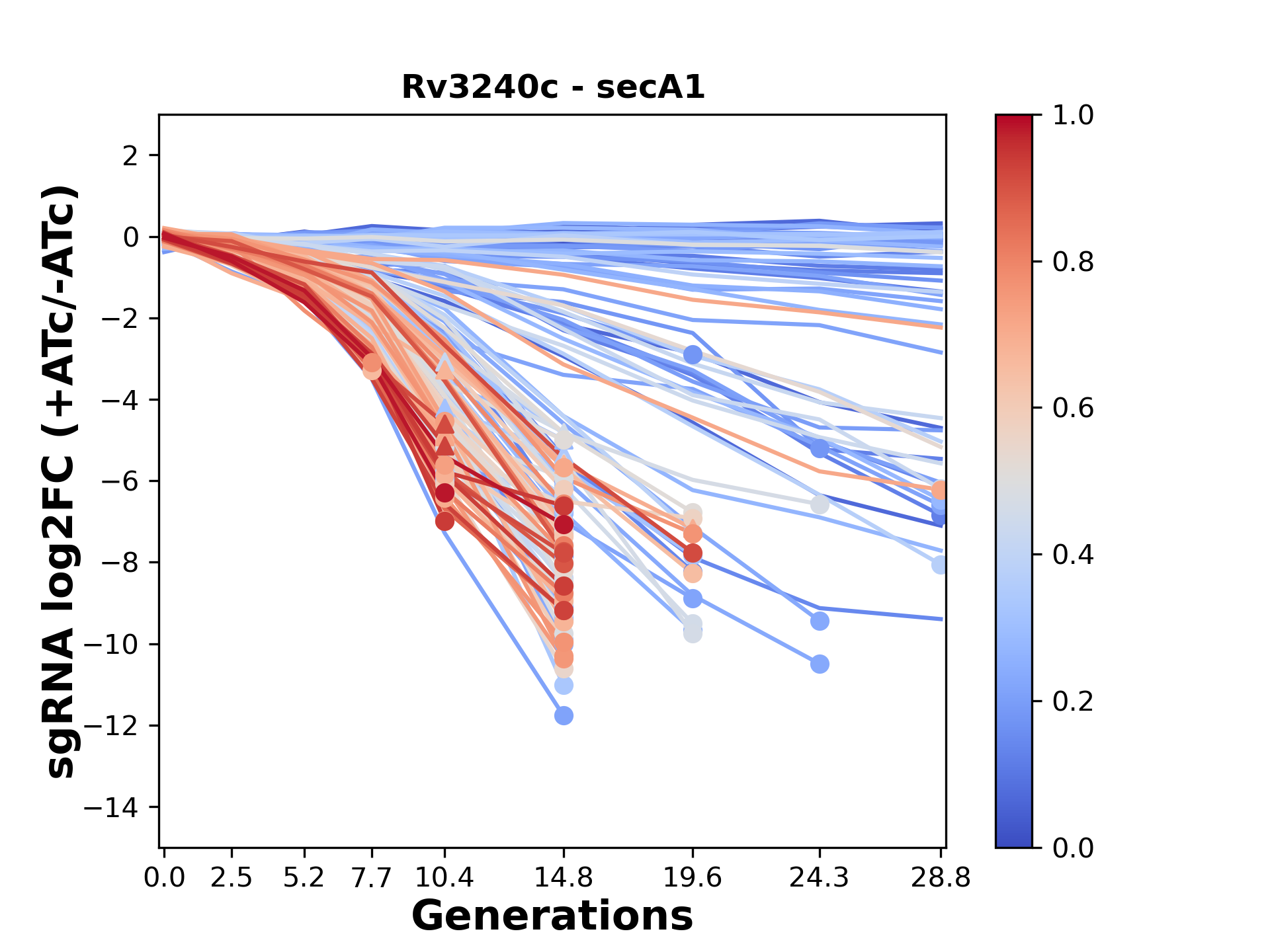 Here, we show sgRNA log2 fold-change values (L2FC) (plus versus minus ATc) over consecutive generations for sgRNAs targeting the gene you selected.