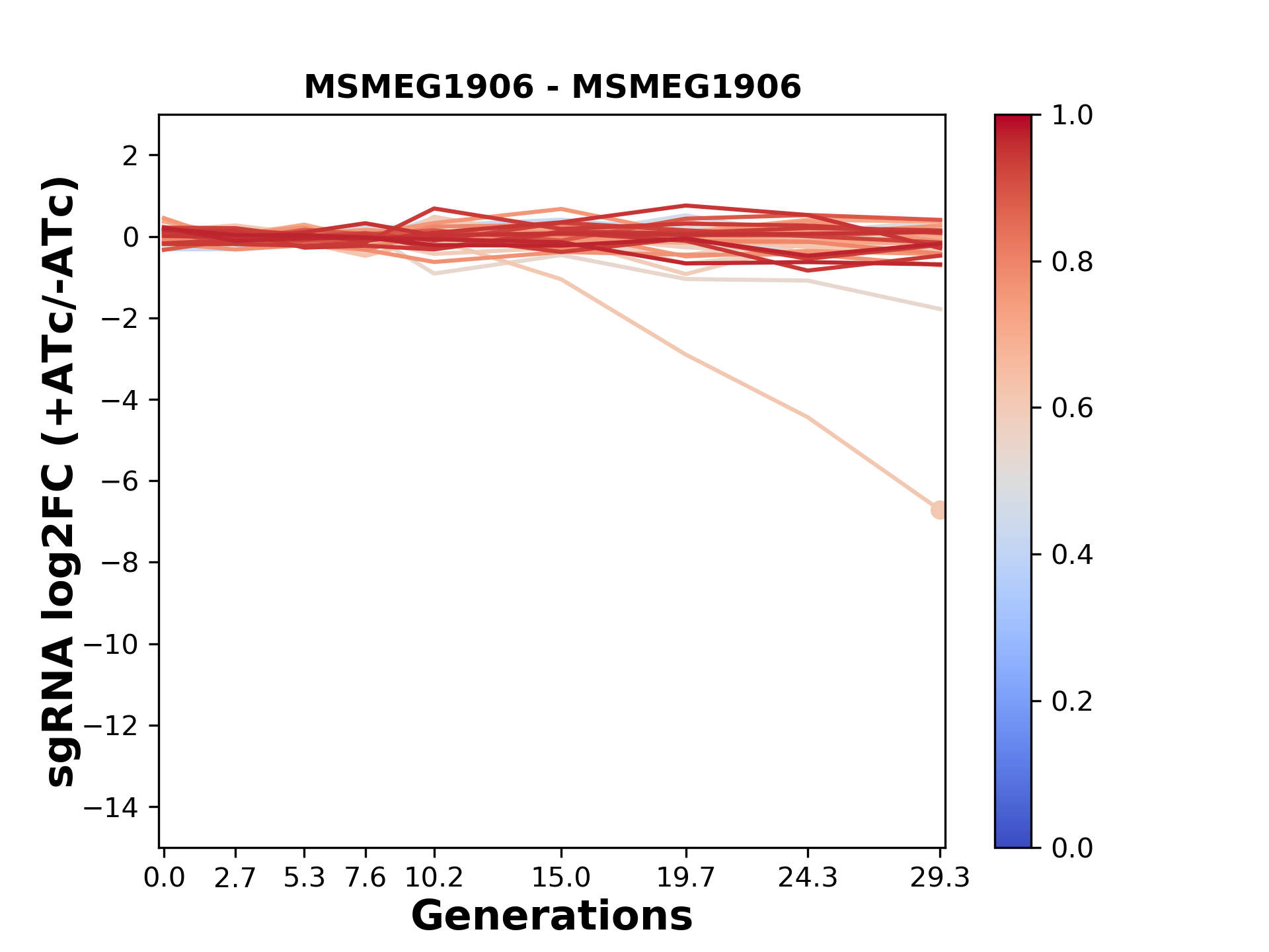 Here, we show sgRNA log2 fold-change values (L2FC) (plus versus minus ATc) over consecutive generations for sgRNAs targeting the gene you selected.