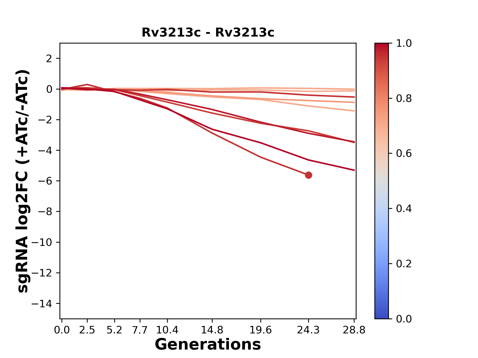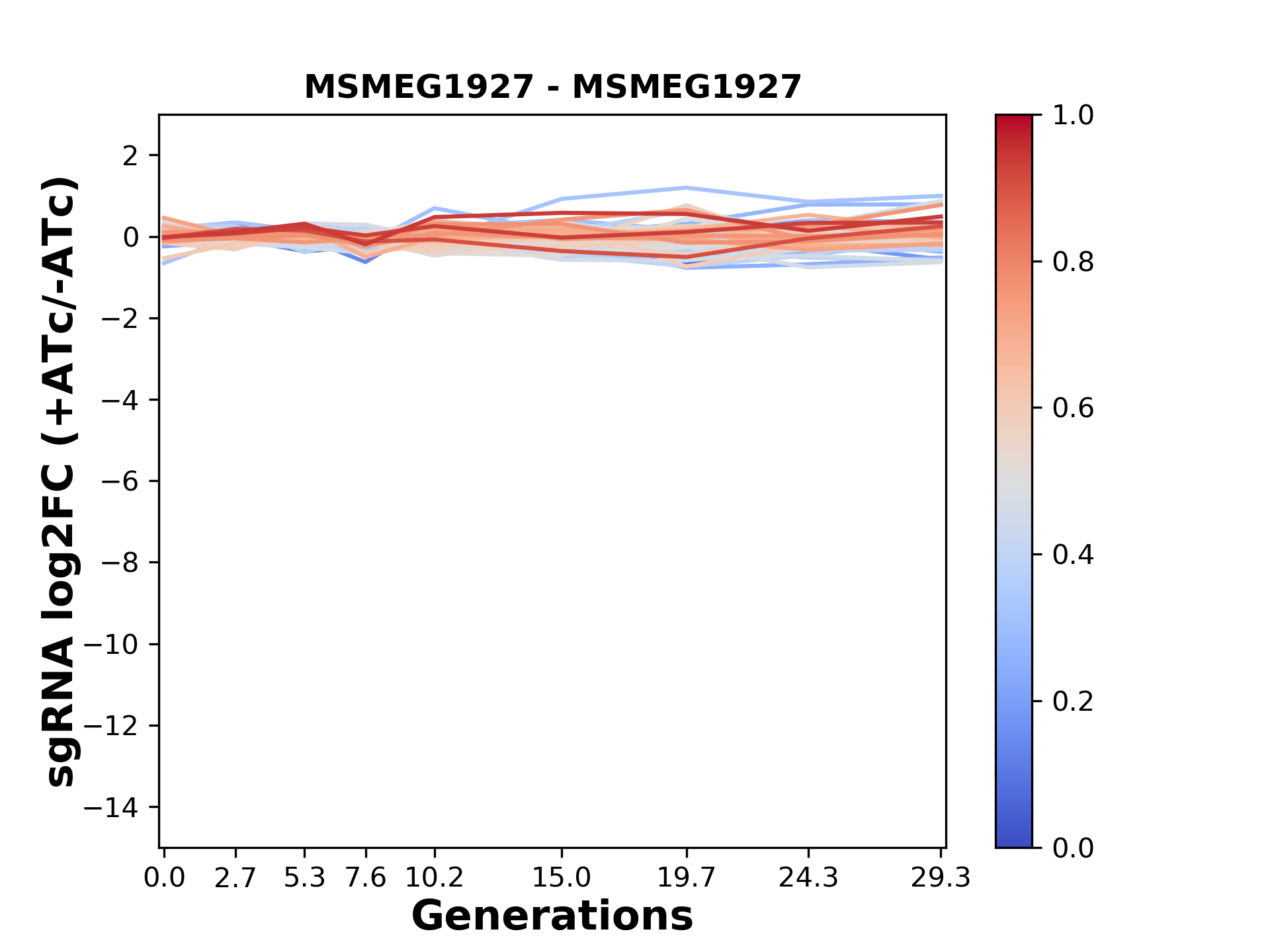 Here, we show sgRNA log2 fold-change values (L2FC) (plus versus minus ATc) over consecutive generations for sgRNAs targeting the gene you selected.