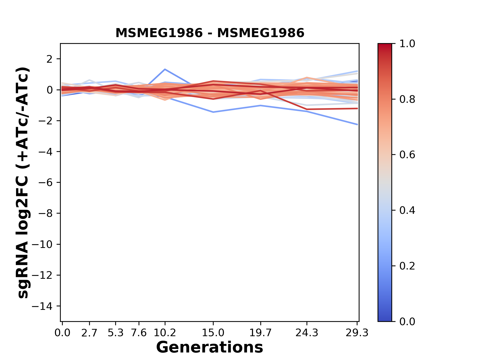 Here, we show sgRNA log2 fold-change values (L2FC) (plus versus minus ATc) over consecutive generations for sgRNAs targeting the gene you selected.