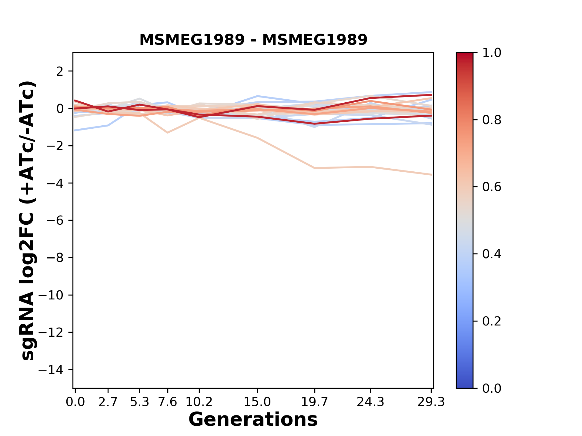 Here, we show sgRNA log2 fold-change values (L2FC) (plus versus minus ATc) over consecutive generations for sgRNAs targeting the gene you selected.
