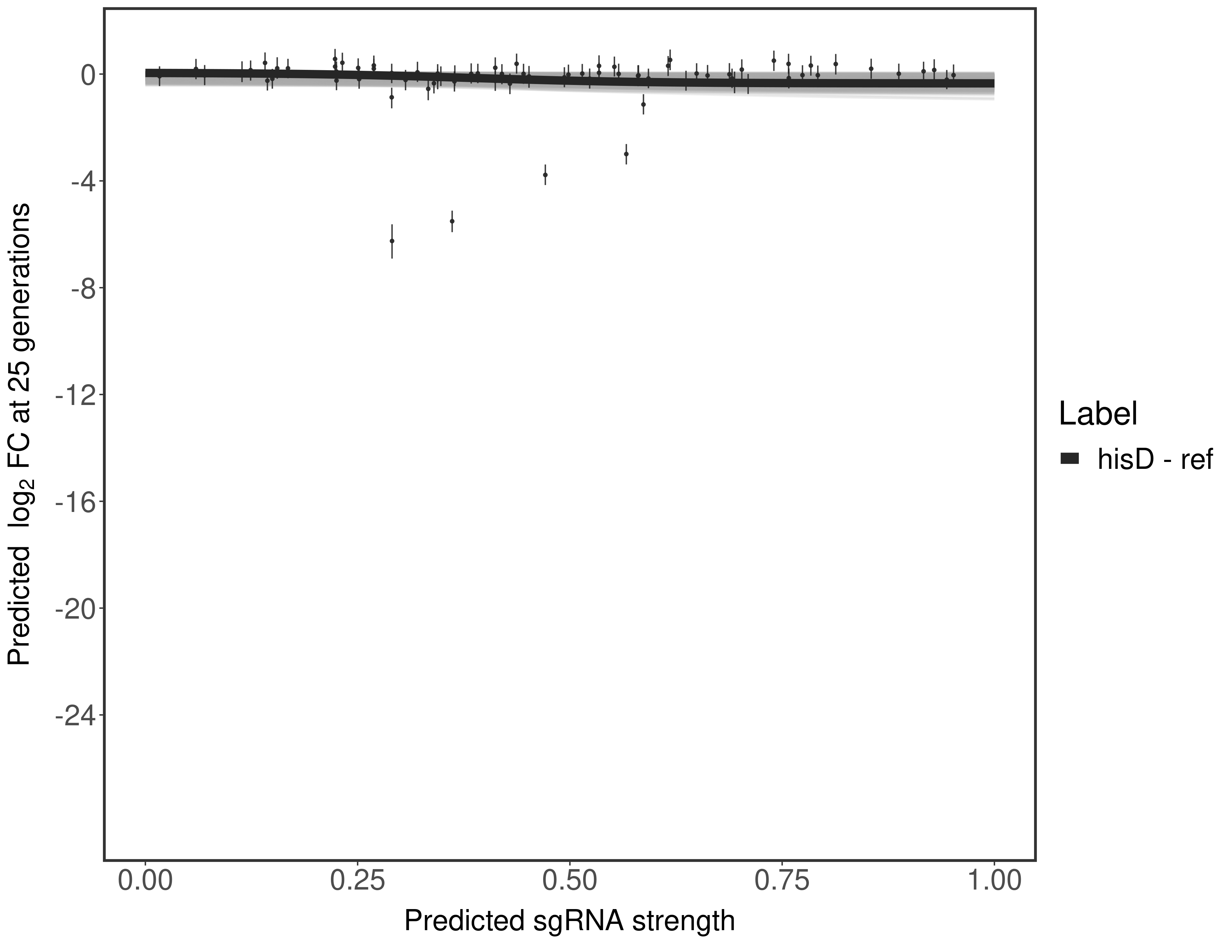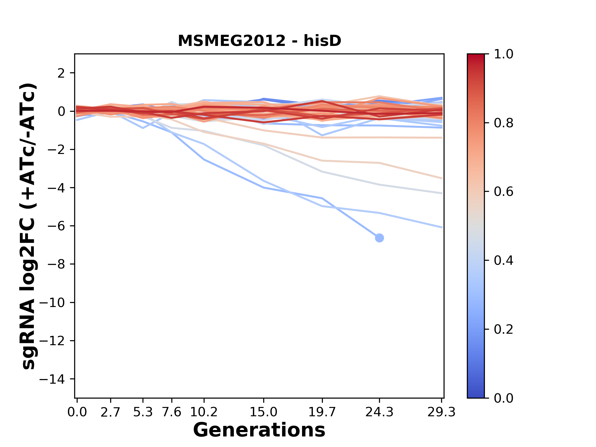 Here, we show sgRNA log2 fold-change values (L2FC) (plus versus minus ATc) over consecutive generations for sgRNAs targeting the gene you selected.