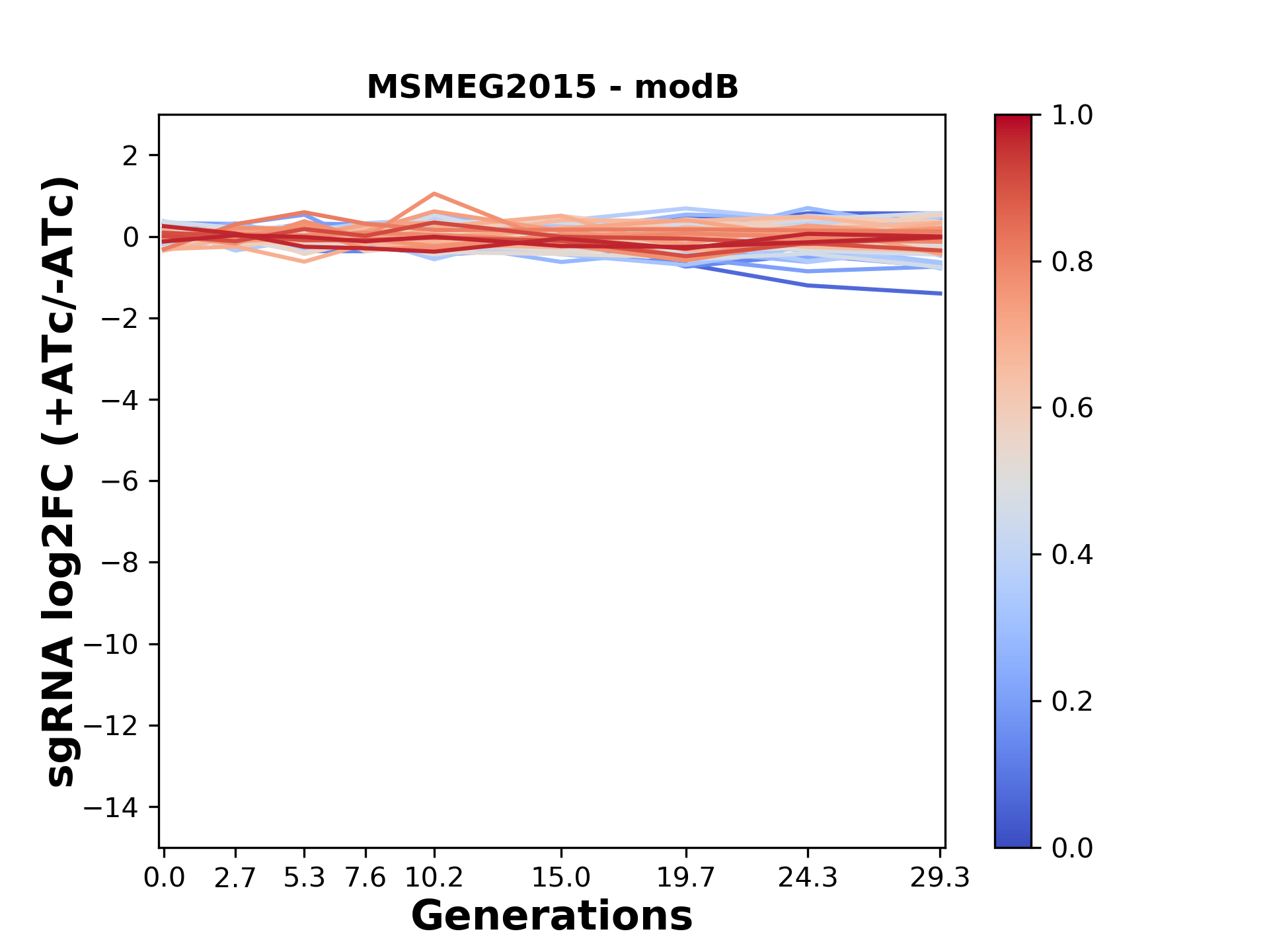 Here, we show sgRNA log2 fold-change values (L2FC) (plus versus minus ATc) over consecutive generations for sgRNAs targeting the gene you selected.